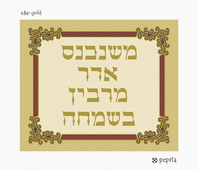 The words "When Adar Starts We Increase Joy" in Hebrew. This is an elegant Adar sign. If you are looking for a cutesy one, we have that too. Adar signs hang in Jewish homes as the holiday of Purim approaches. It is a special time of Simcha and Mazel.