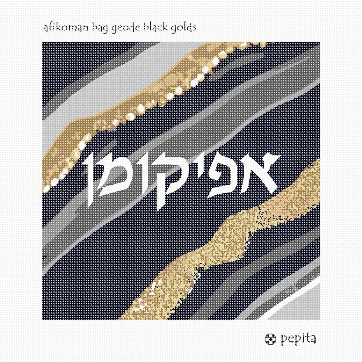 A geode is a stone having a cavity lined with crystals or mineral matter. Most geodes contain clear quartz crystals. Geodes are found all over the world especially in desert regions.This summer I experimented with resin art to create geode looks on glass. That inspired me to design tefillin, tallit, and challah covers with geode characteristics. This one is a collage of geode patterns. This afikoman bag coordinates with Matzah Cover Geode Black Golds. This contemporary design is a classic and will never go out of style. This design is truly fit for a king.