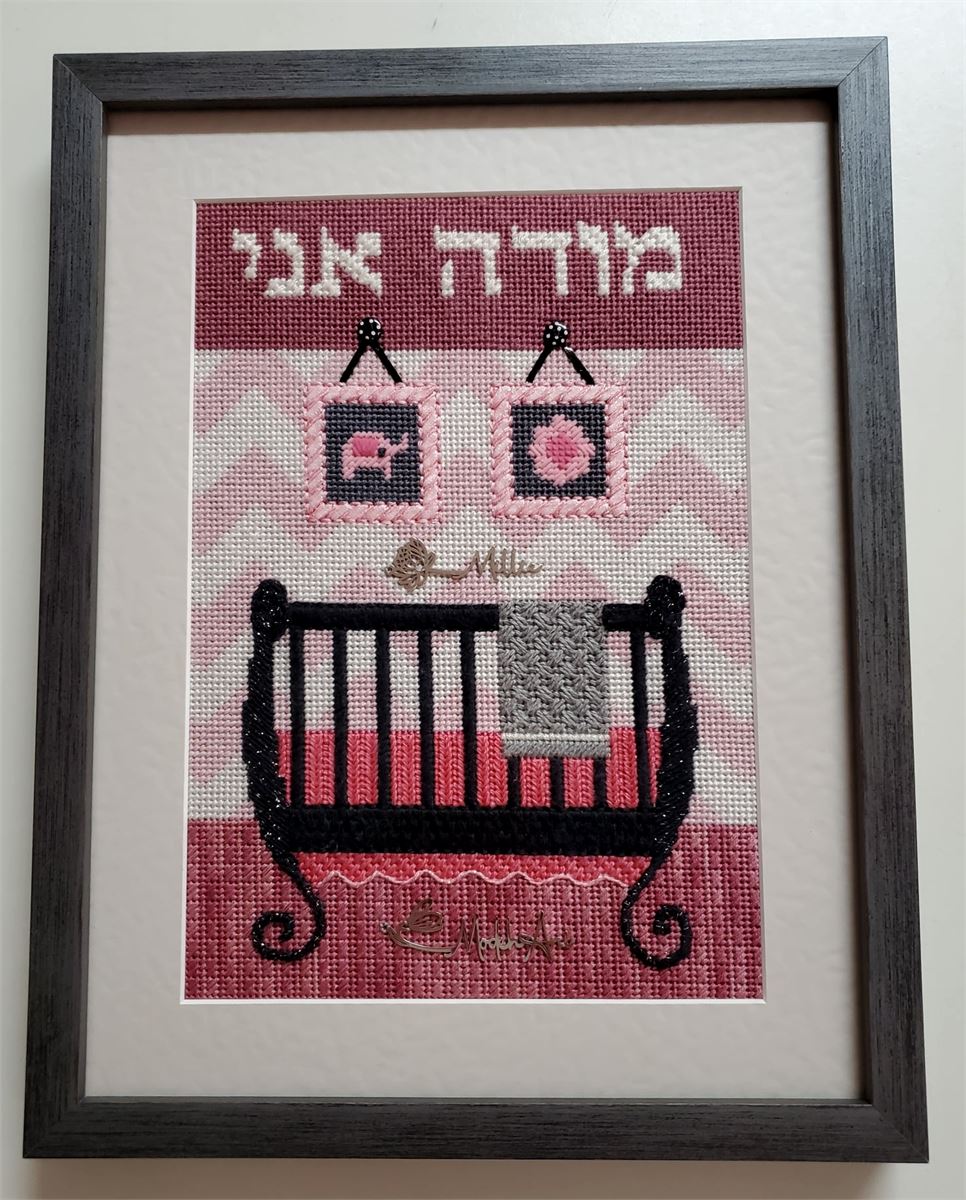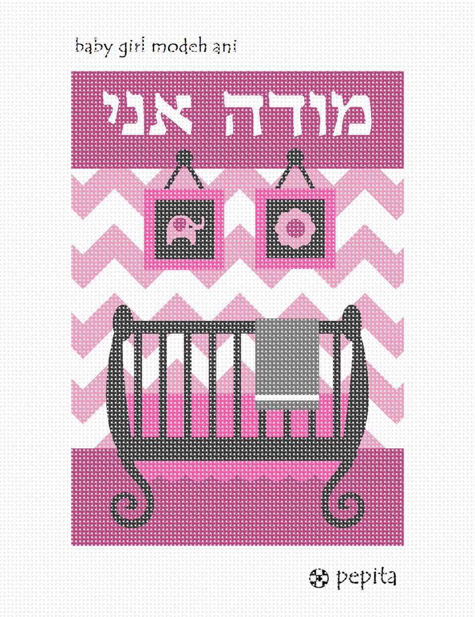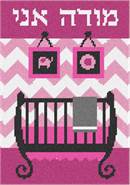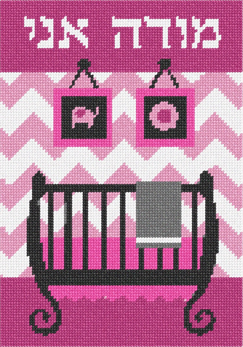 Perfect for a baby girl nursery - will last for generations - with the Hebrew words of thanking G-d.Perfect for a baby nursery - good for either boy or girl - will last for generations - with the Hebrew words of thanking G-d. Chevron pattern is the "in thing" in baby layette today. Crib sheets and diaper pads are all chevron. We thank Hashem when we wake up each morning when we recite Modeh Ani...