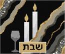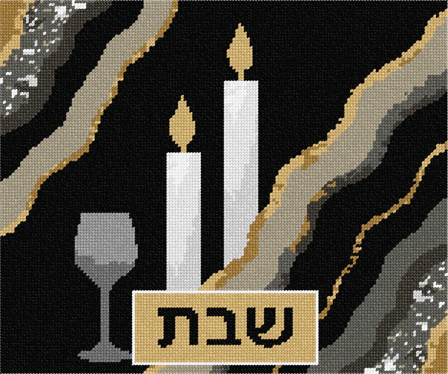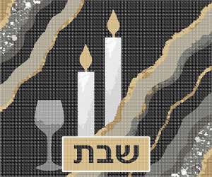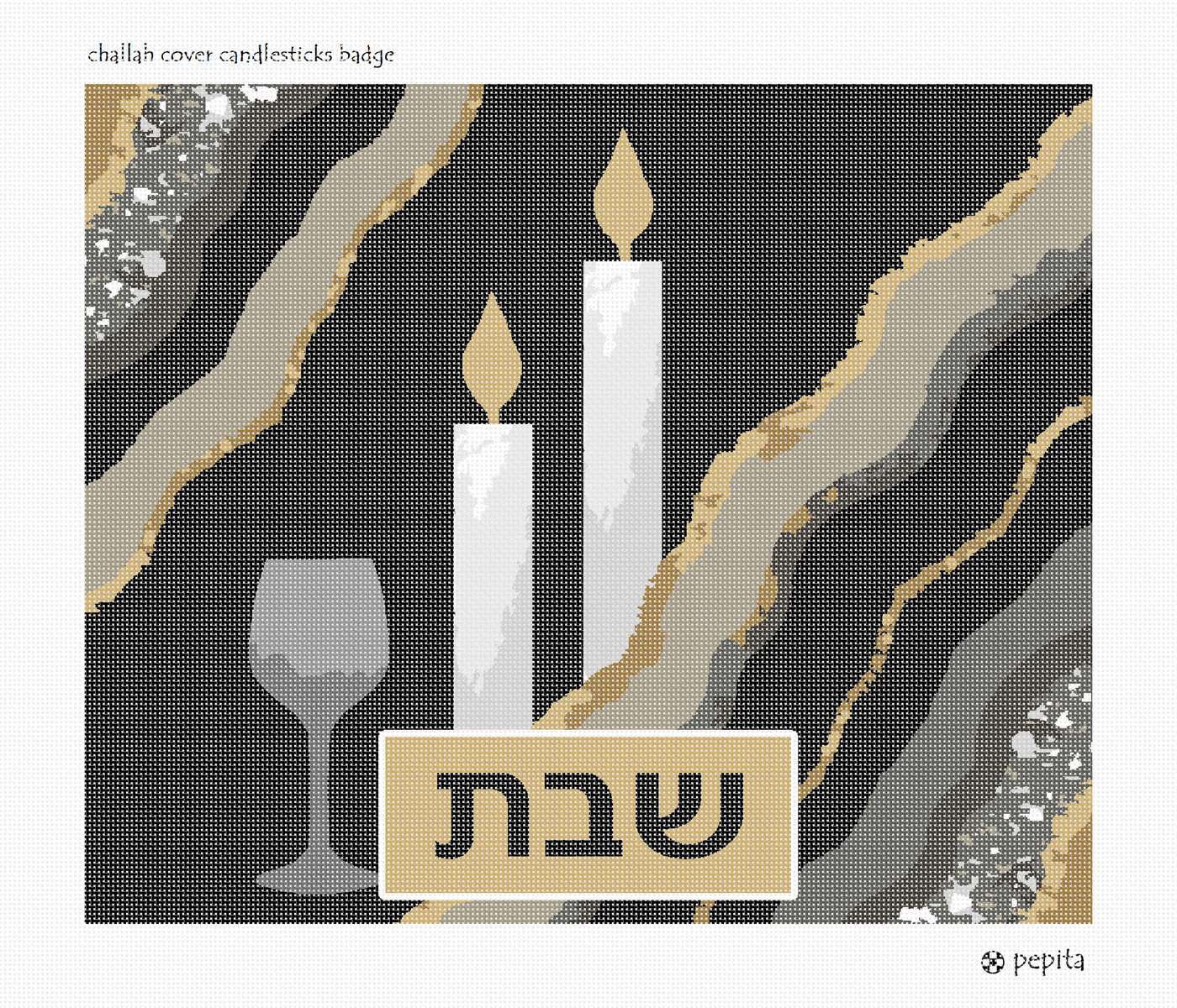Agate design challah cover with two candlesticks and a kiddush cup. Modern and beautiful. Large size should fit two family sized challahs. This design has the word "Shabbos" in a centered gold plaque/badge style.