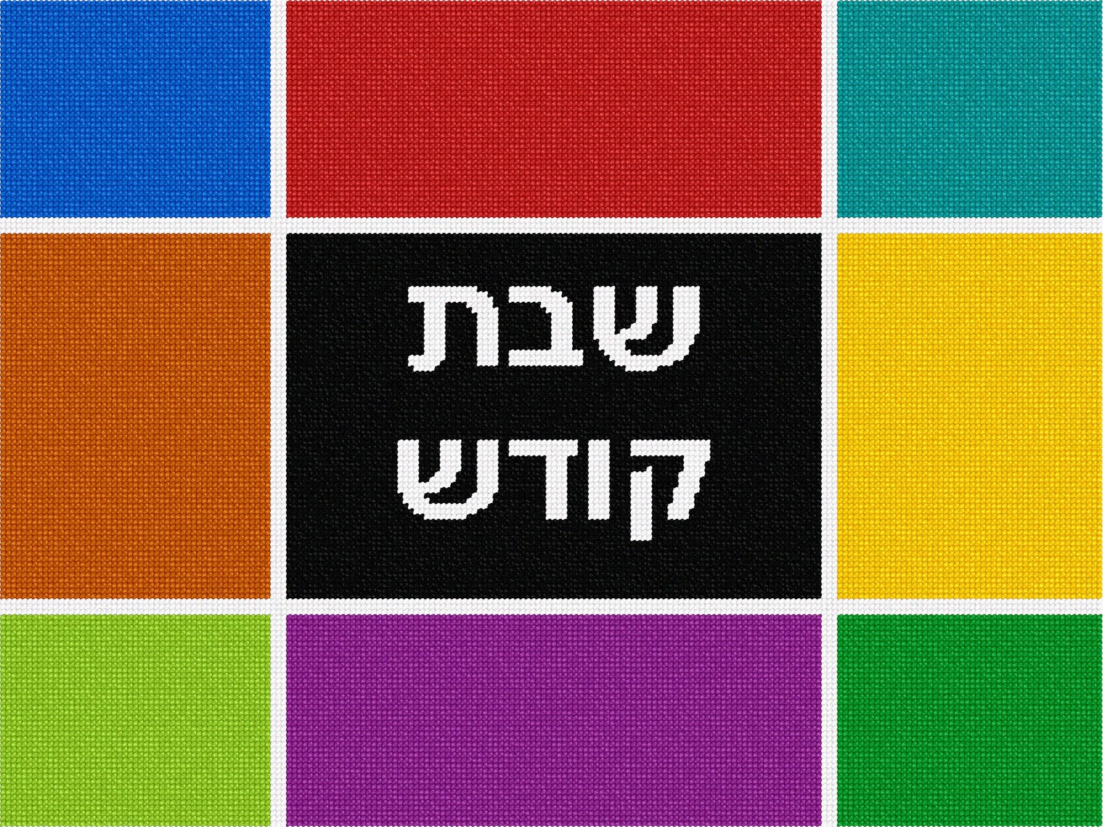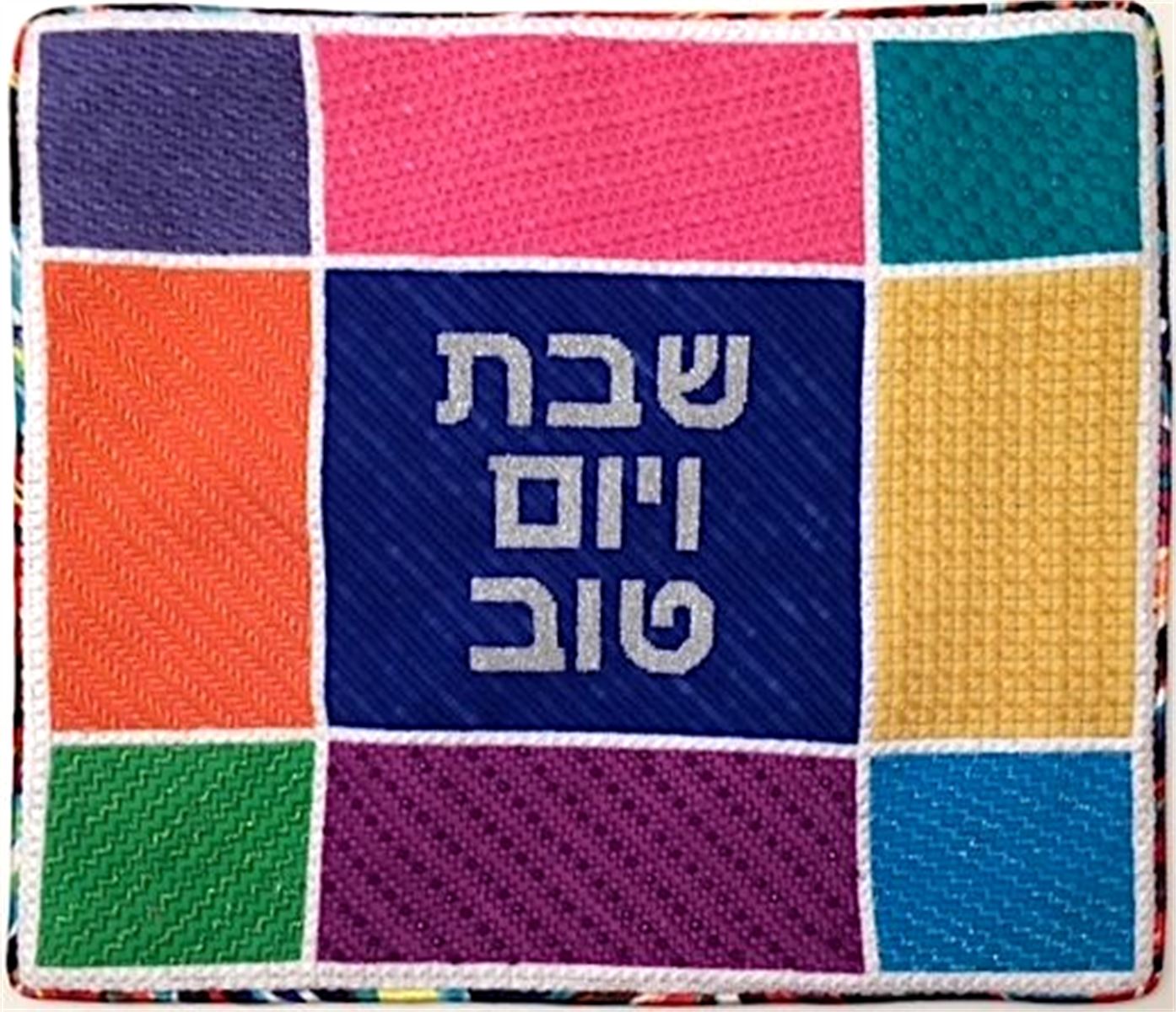 A challah cover for Shabbat all full of color. You stitch the front. After it is completely stitched, it is sent to a professional finisher who adds a lining and a fringe or rope border.