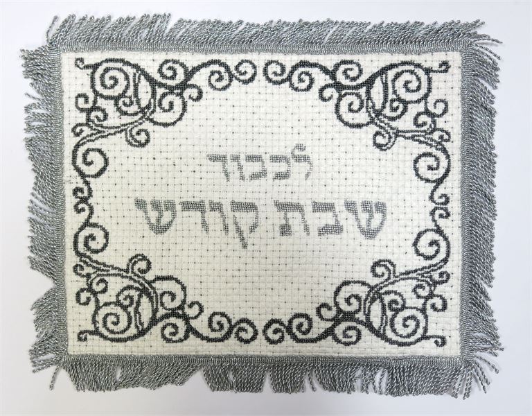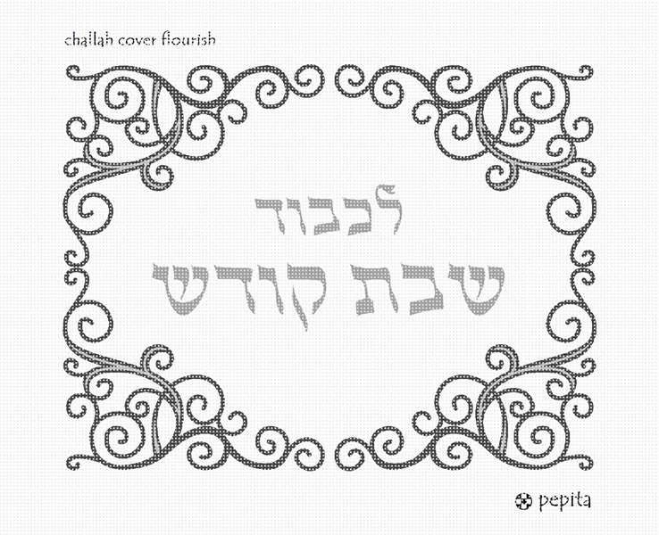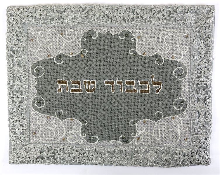 Traditional Challah cover framed in resplendent flourishes. Stitch the front of this fantastic challah cover. Then it is given to a professional finisher who blocks it, sews a lining, and attaches a fringe or rope border edge.
