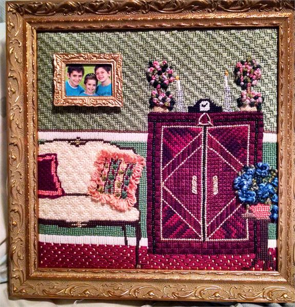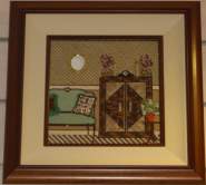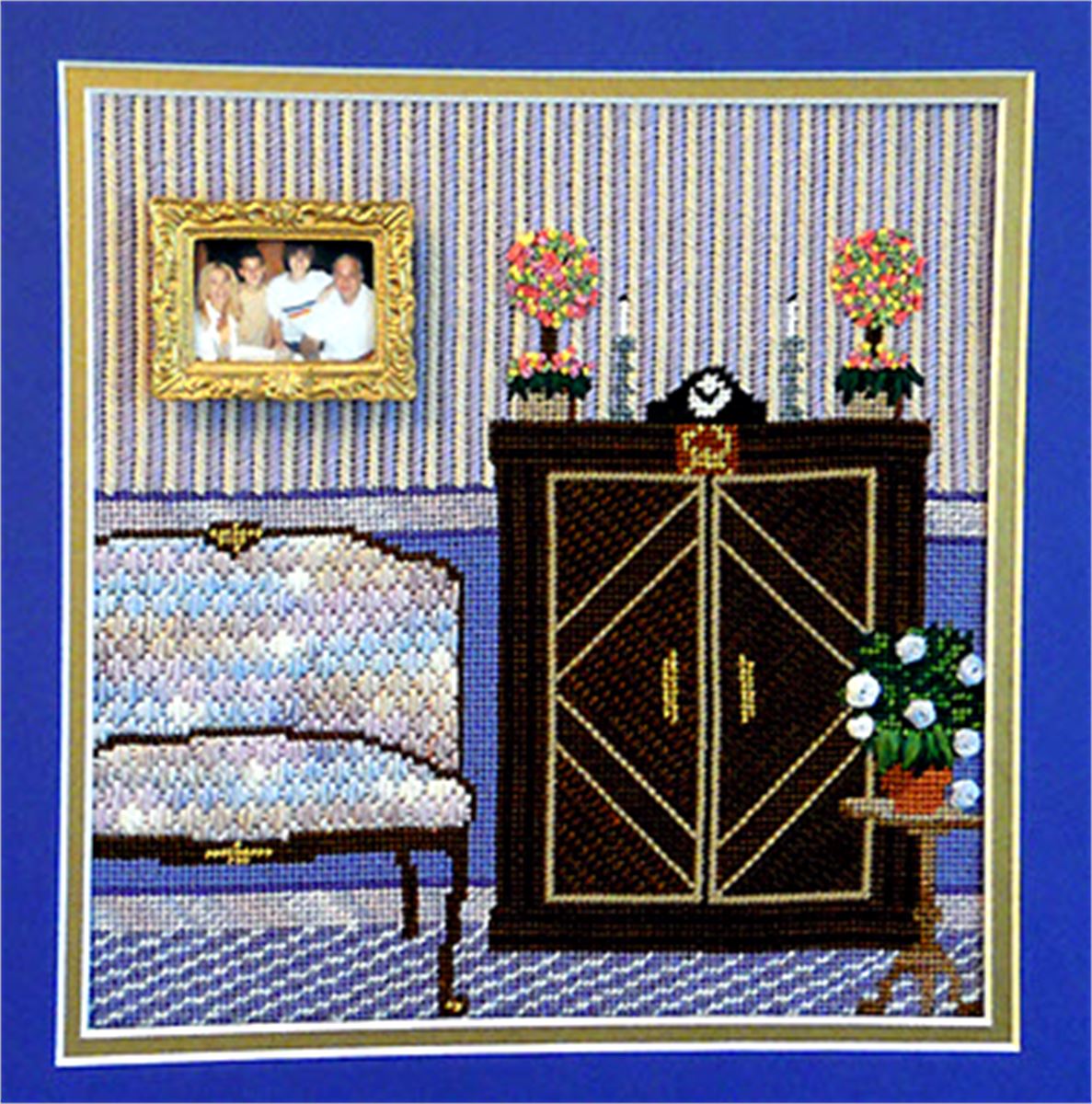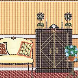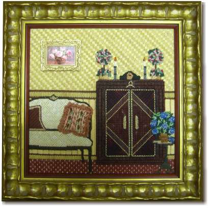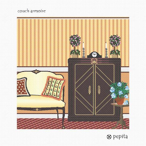 A couch with two pillows, a varnished armoir, and a selection of topiaries. This design coordinates with others in our Home Sweet Home series. A house is made of walls and beams, a home is built with love and dreams. ...