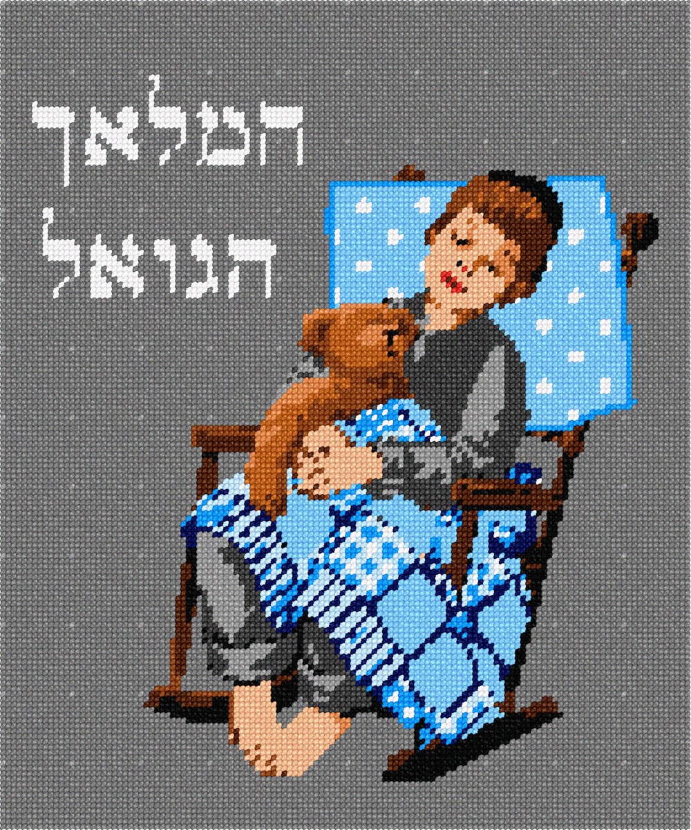 A little boy is dozing with his teddy on a wooden rocking chair. He is covered in a patchwork quilt, and his head is resting on a polka dot pillow. The prayer of "HaMalach HaGoel" is recited after Shema at bedtime.