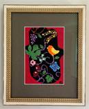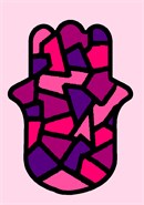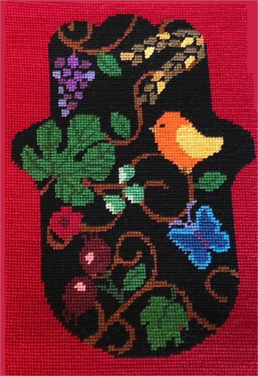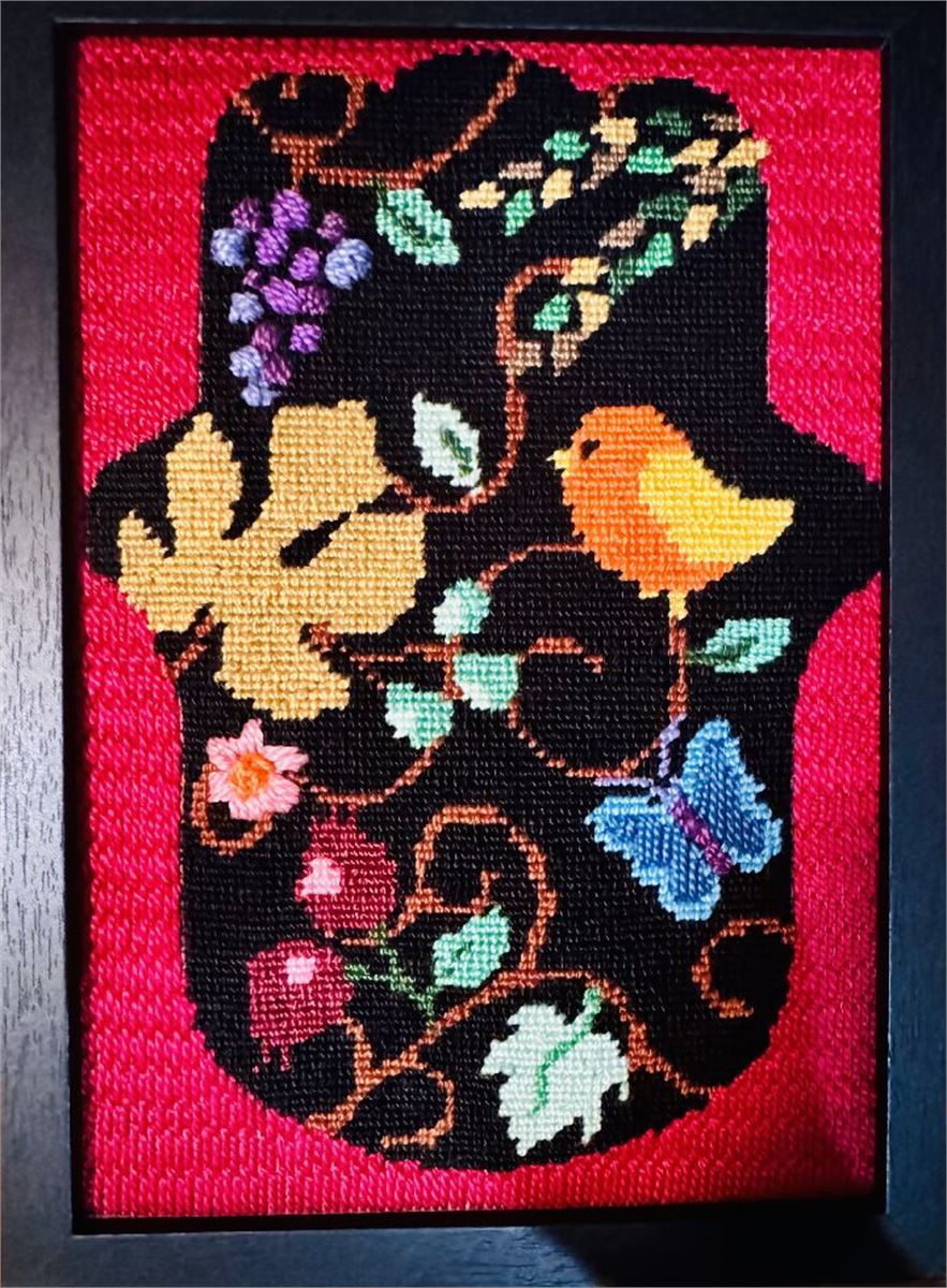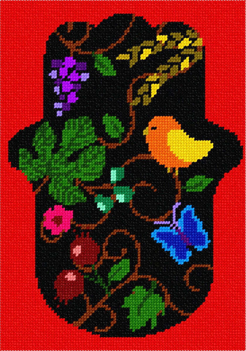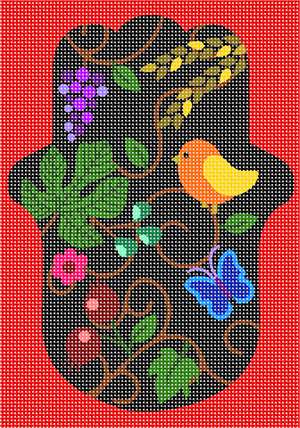 Hamsa with the seven species, a bird, butterfly, and flowers. A hamsa is a palm-shaped amulet popular throughout the Middle East and North Africa and commonly used in jewelry and wall hangings.