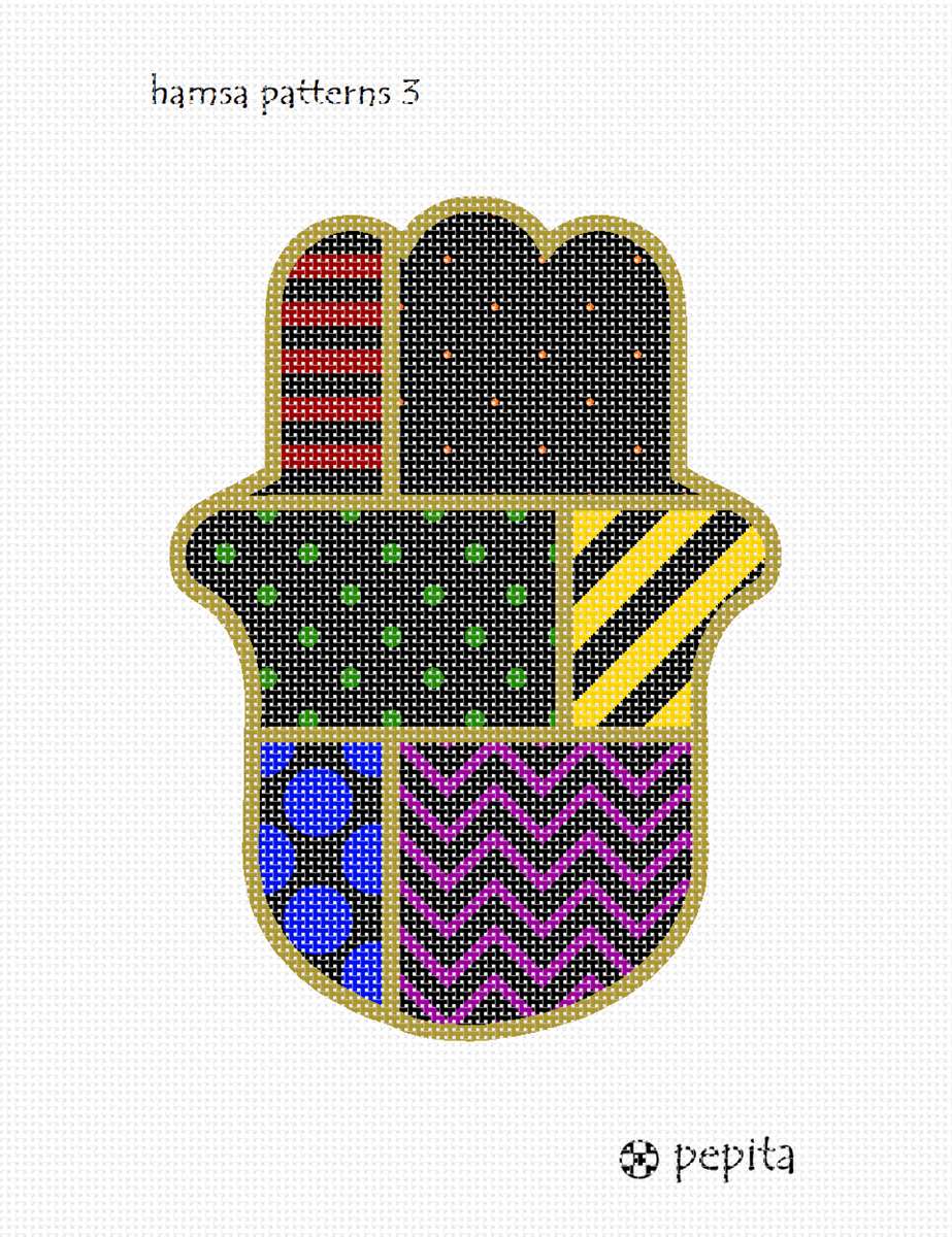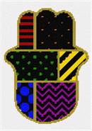 Geometric patterns are very vogue in needlepoint today. A hamsa is a palm-shaped amulet popular throughout the Middle East and North Africa and commonly used in jewelry and wall hangings. This design is available in three different color choices.
