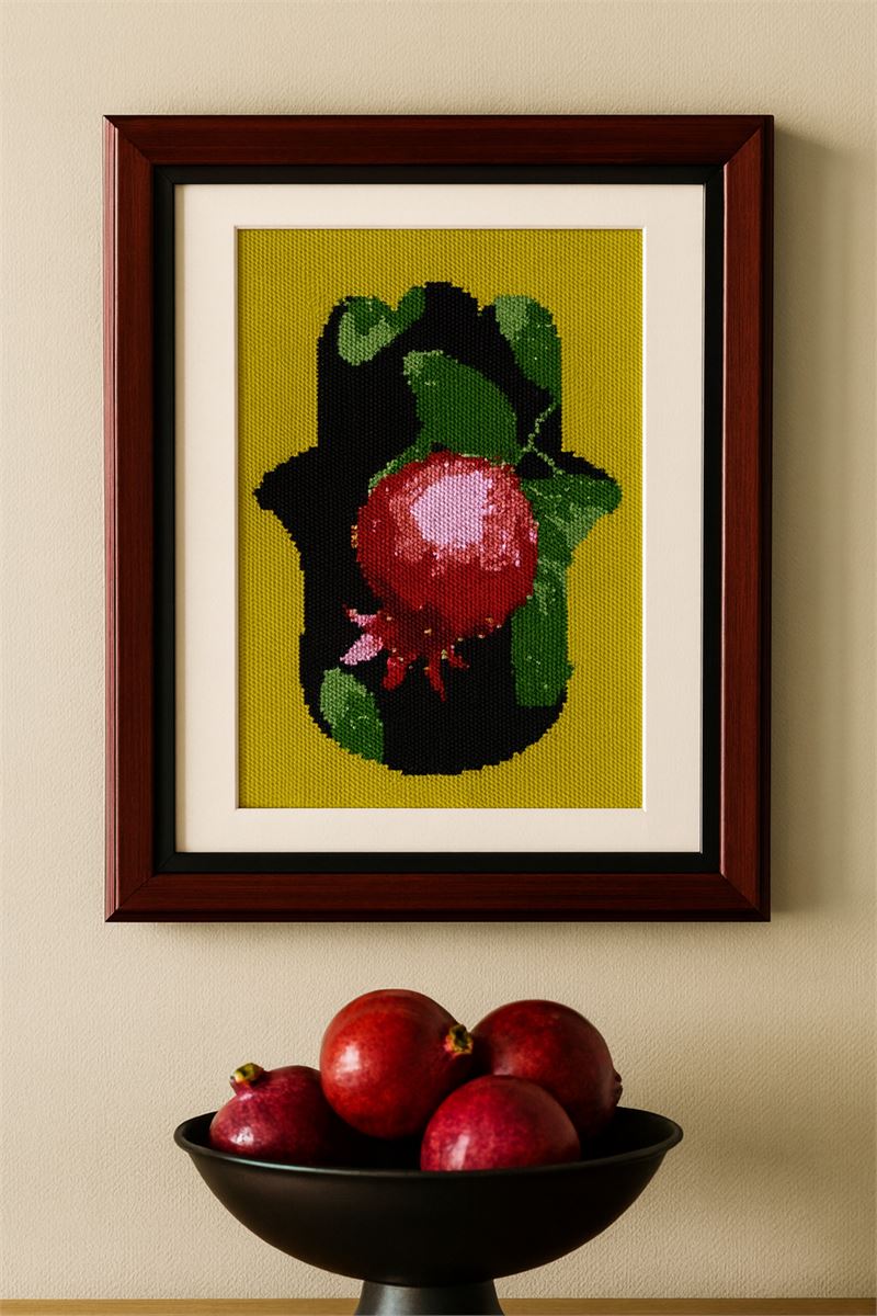Hamsa with a pomegranate theme. A hamsa is a palm-shaped amulet popular throughout the Middle East and North Africa and commonly used in jewelry and wall hangings.
