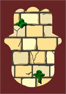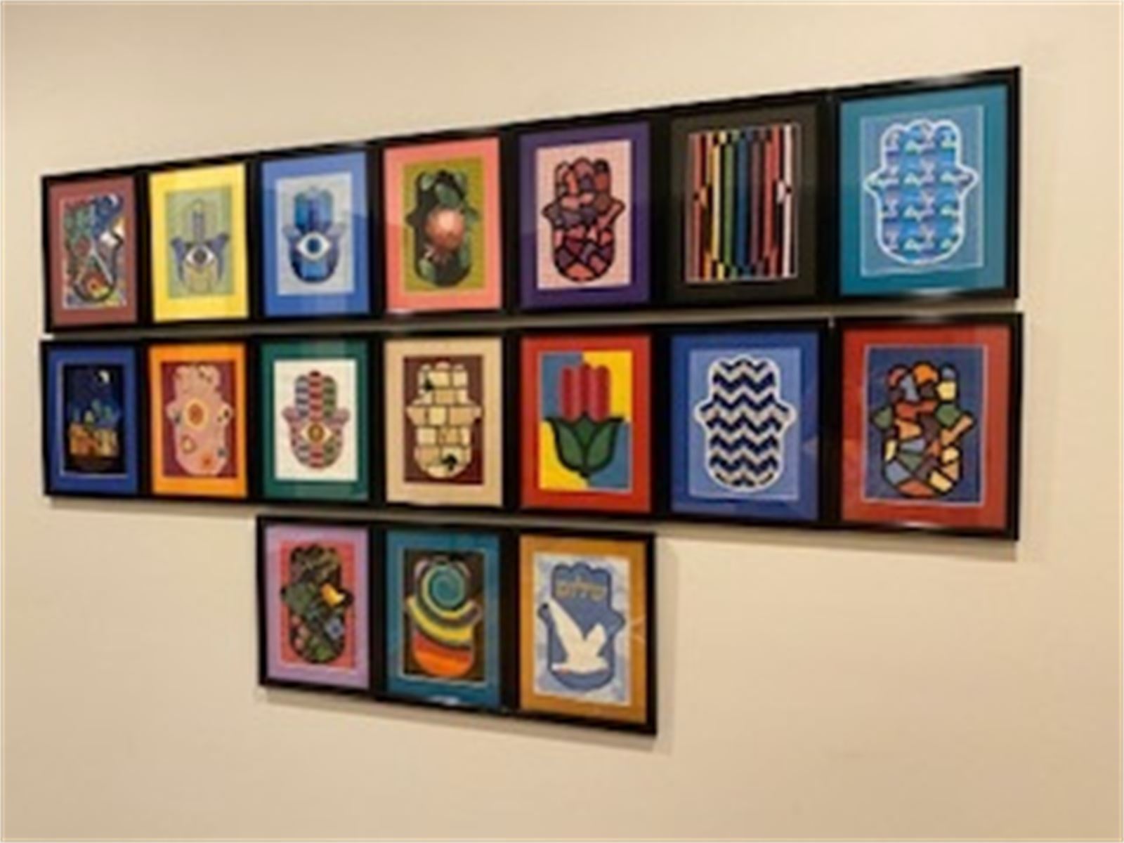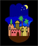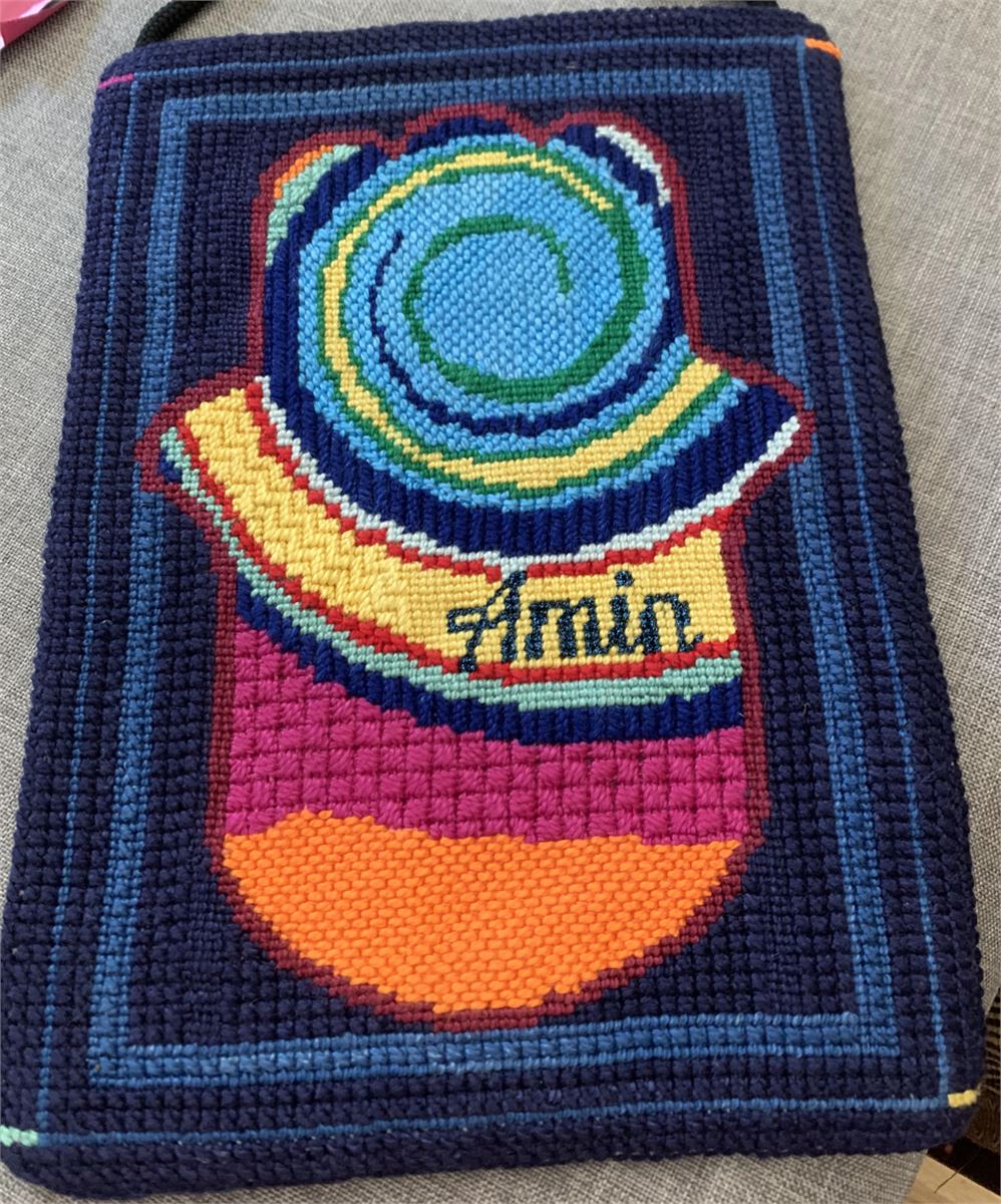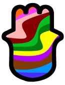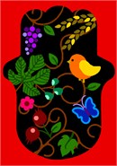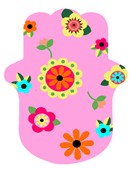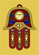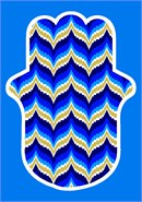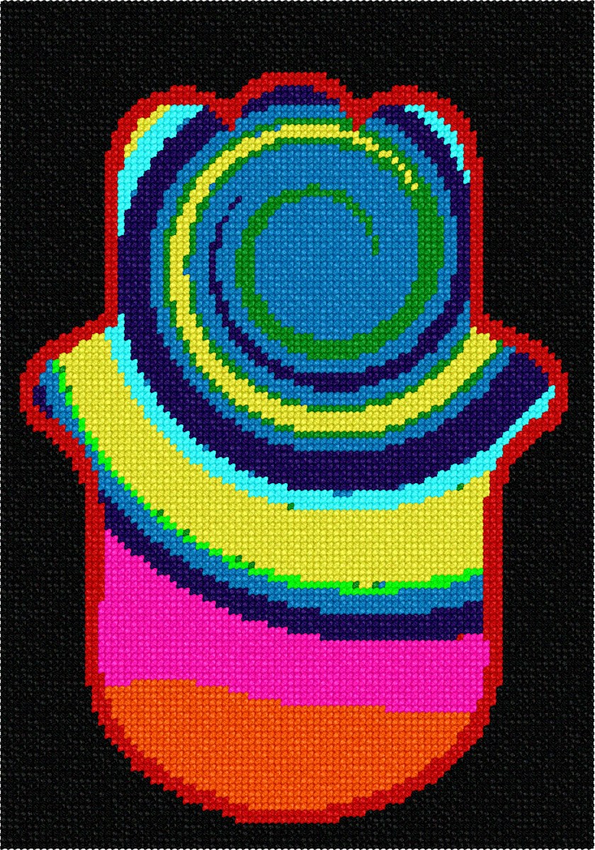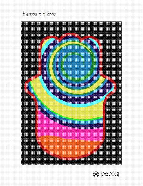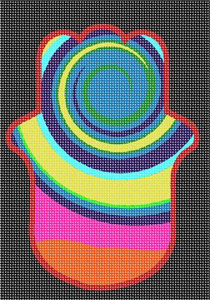 A hamsa in modern tie dye fashion. A hamsa is a palm-shaped amulet popular throughout the Middle East and North Africa and commonly used in jewelry and wall hangings.