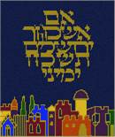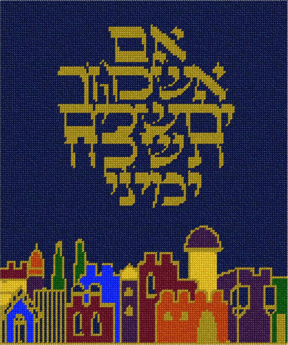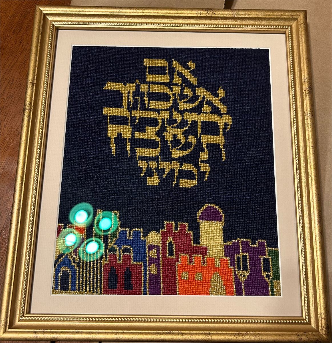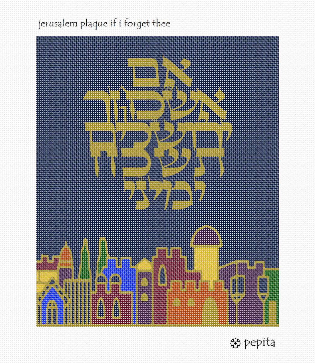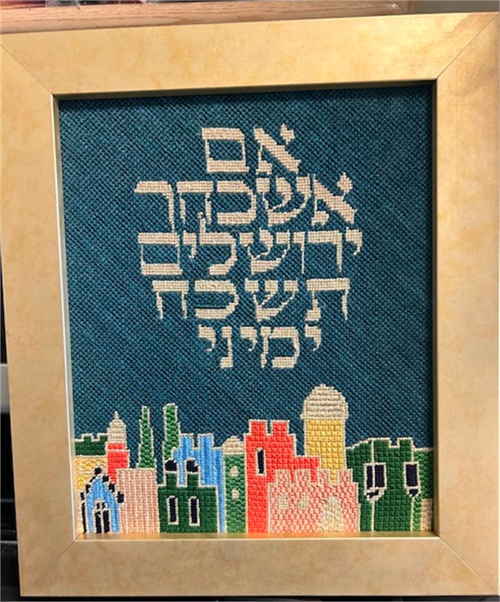 The Hebrew verse from Psalms 137: If I forget thee, Jerusalem, let my right hand forget its cunning. Jerusalem scenes are very popular in needlepoint. Many Jewish homes have a Jerusalem plaque adorning the walls. This is a night scene with the Hebrew letters stitched in metallic gold.