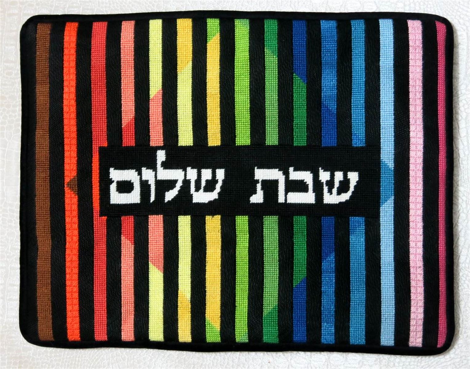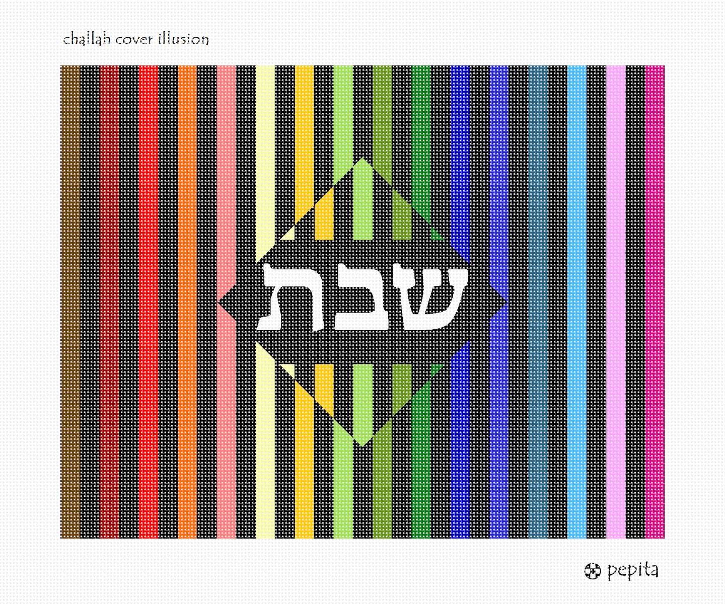Colorful and chic, this design is a winner. Soft and serene in honor of the Shabbos Queen. Flowers are absolutely stunning! You stitch the front. After it is completely stitched, it is sent to a professional finisher who adds a lining and a fringe or rope border. We have many designs in our "illusion" series.