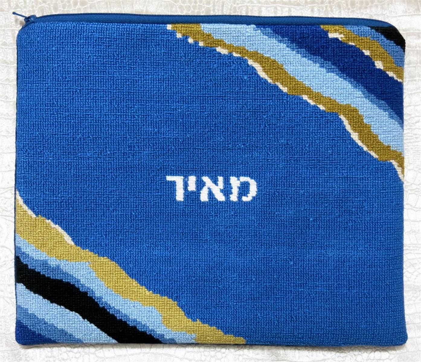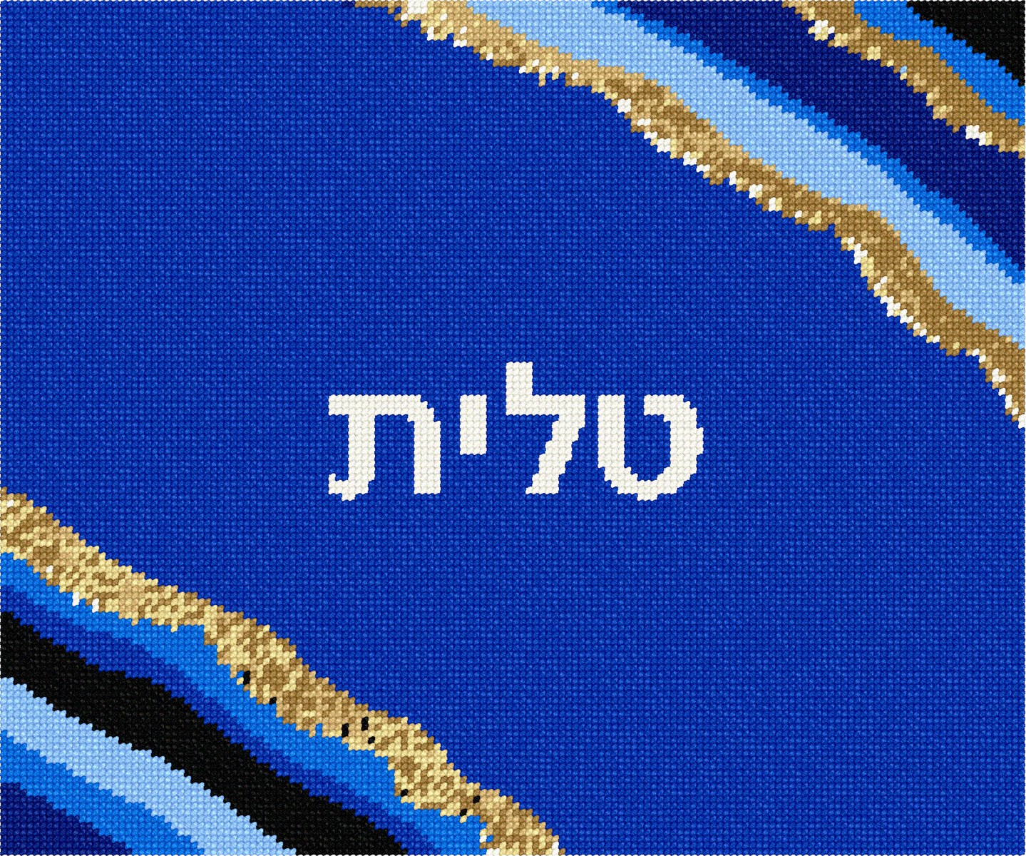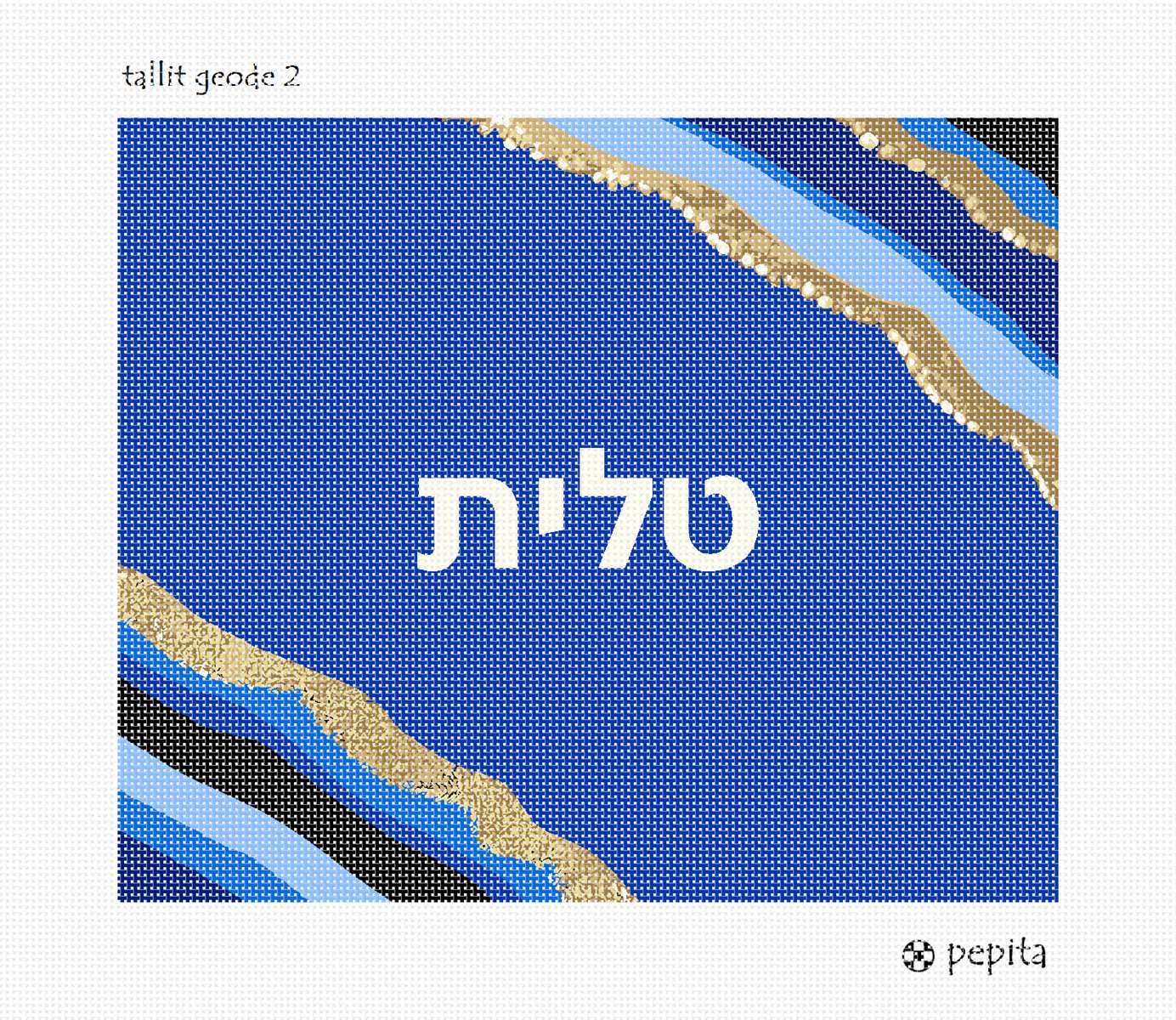 A geode is a stone having a cavity lined with crystals or mineral matter. Most geodes contain clear quartz crystals. Geodes are found all over the world especially in desert regions.This summer I experimented with resin art to create geode looks on glass. That inspired me to design tefillin, tallit, and challah covers with geode characteristics. This one is simpler than Tallit Geode 2 and also easier to stitch.