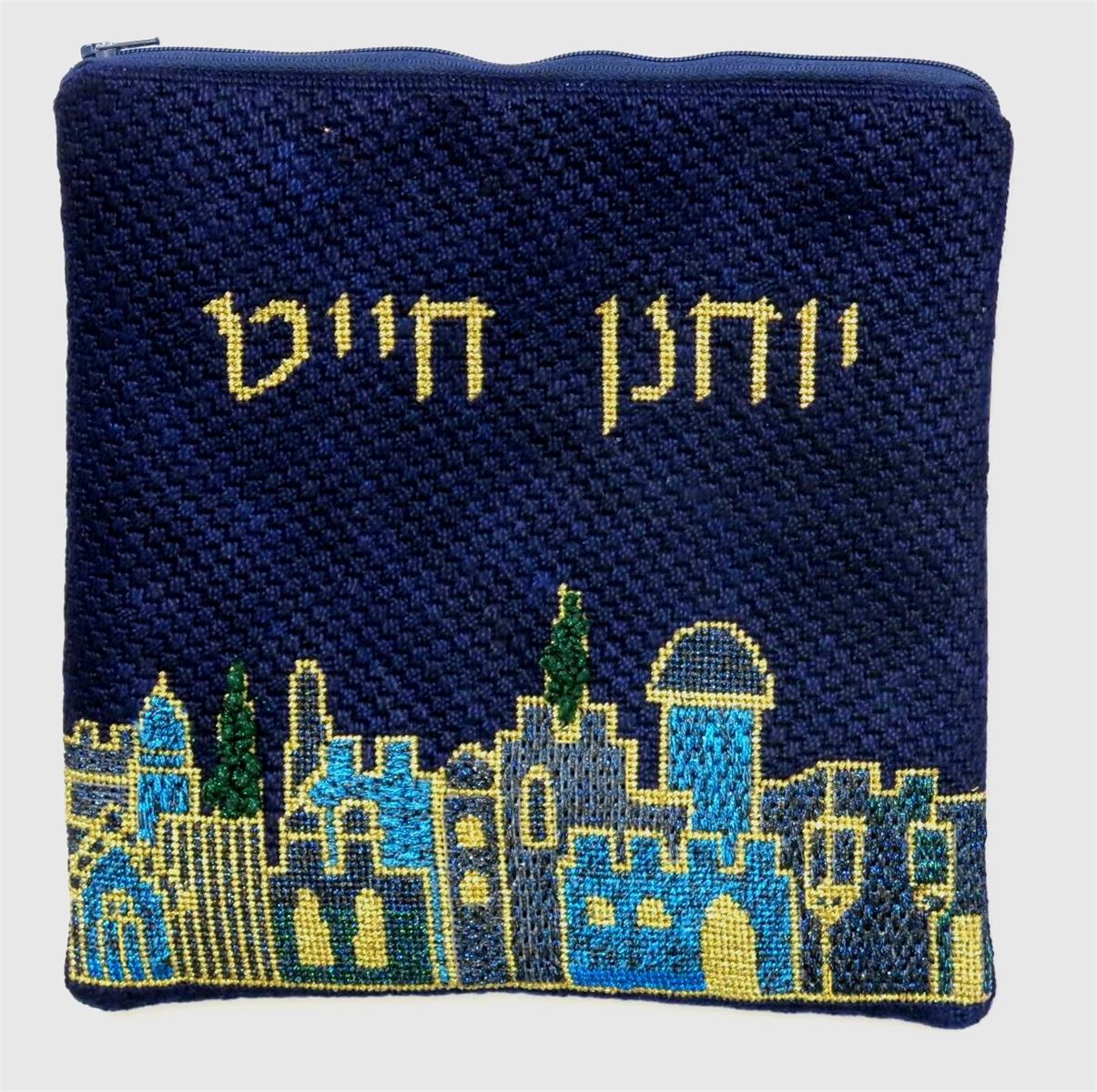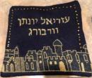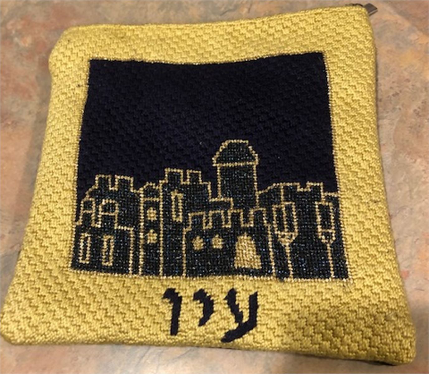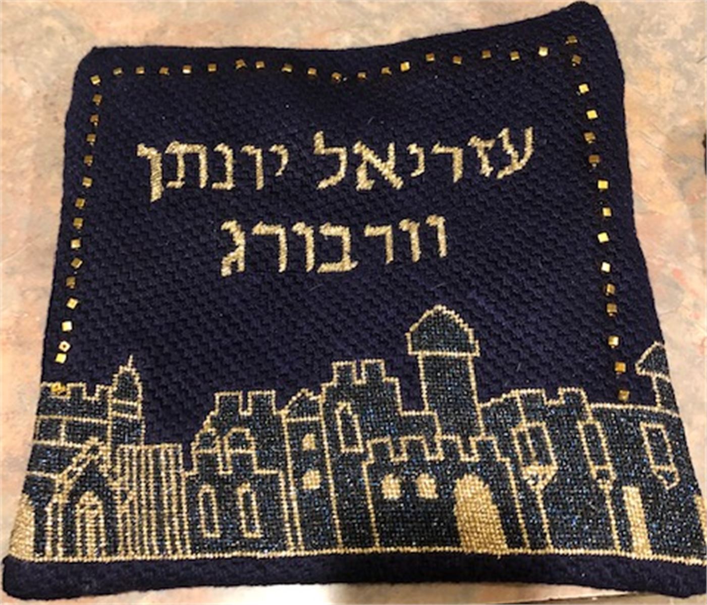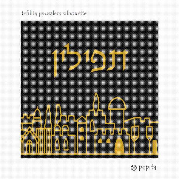 A tefillin bag with the Jerusalem skyline lighting up the night. A classic beauty in needlepoint tefillin designs. Jerusalem scenes are very popular judaica designs. Tefillin are gifted to a Jewish boy upon his bar mitzvah when he turns thirteen. He is taught how to perfom this holy Mitzvah properly before his birthday. You stitch the front. After it is completely stitched, it is sent to a professional finisher who adds a lining, back, and matching zipper.