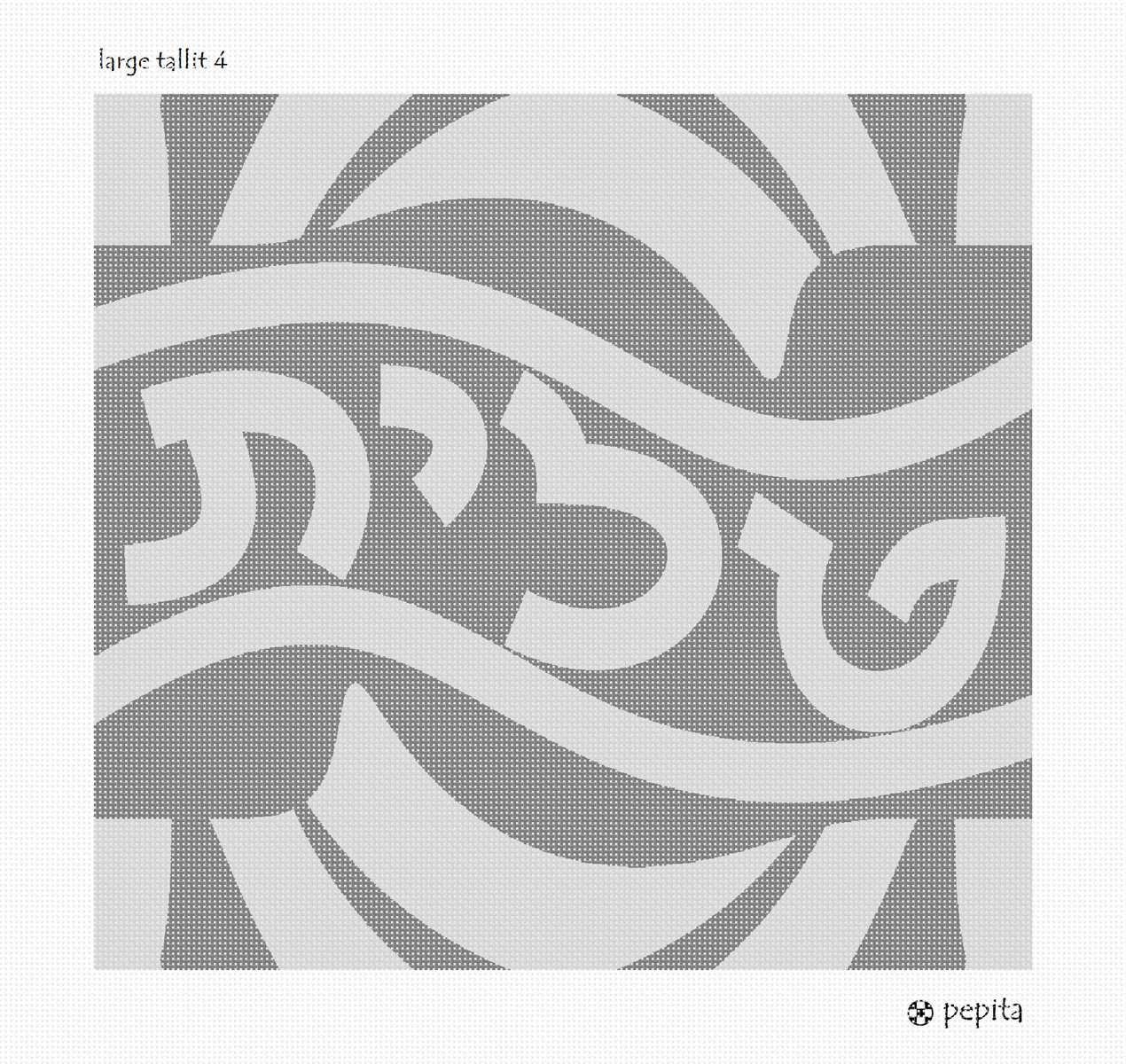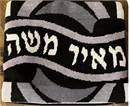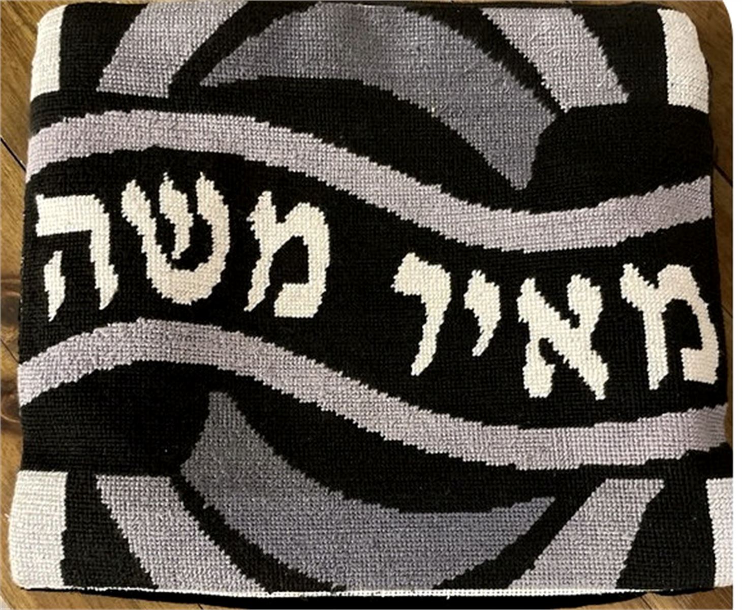 Tallit bag with a funky stripe design. You stitch the front. After it is completely stitched, it is sent to a professional finisher who adds a lining, back, and matching zipper.
