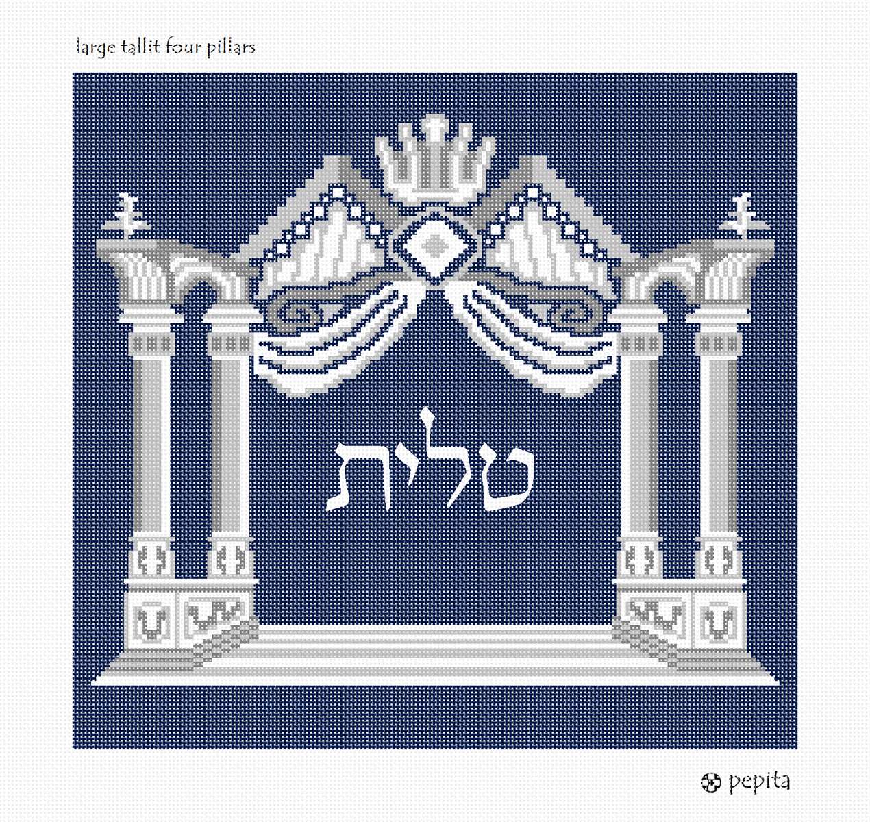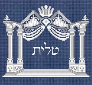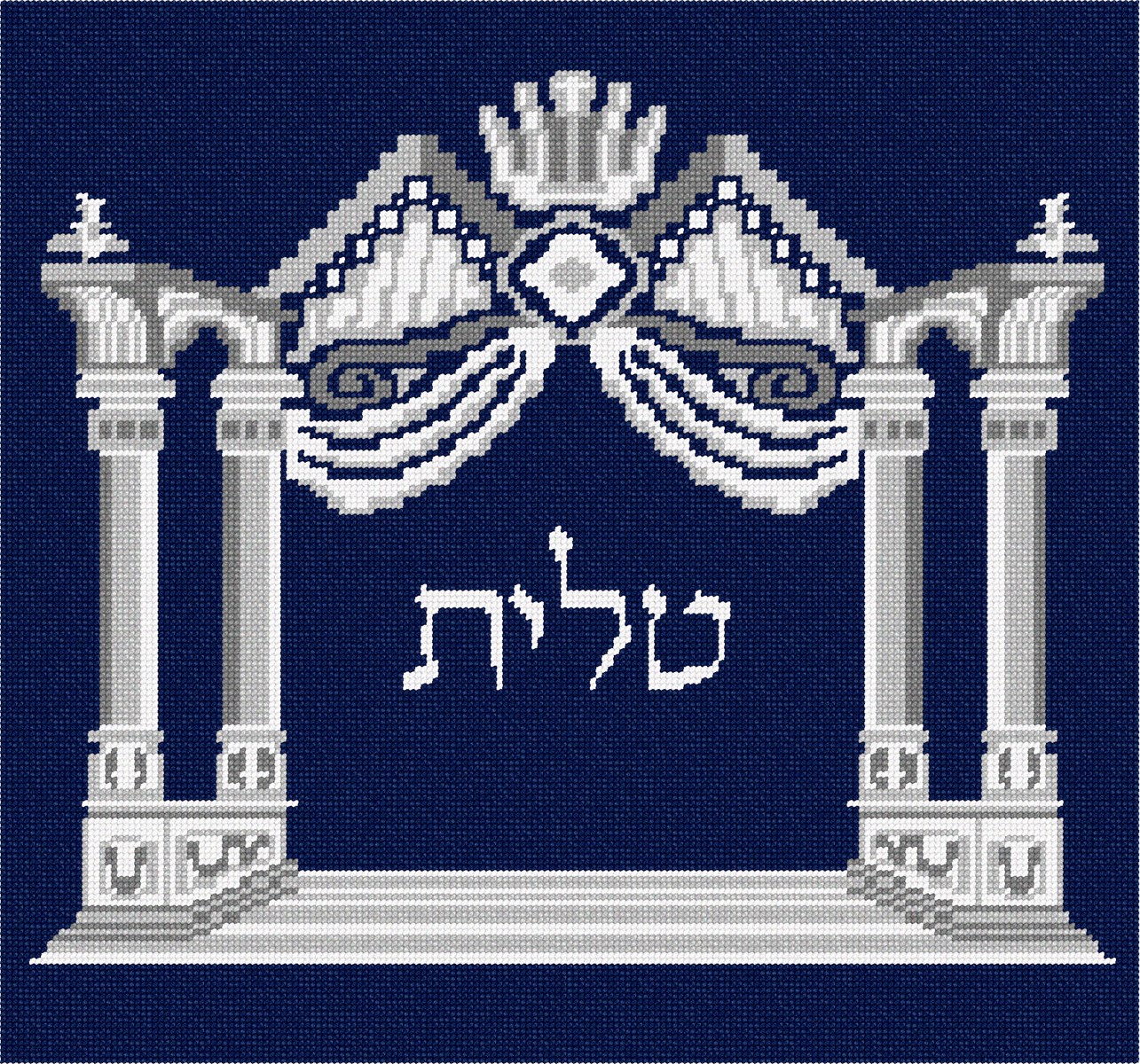This special design was first conceived in the 19th century and printed on the title page of the Vilno Talmud. For the first time, it has been adapted for needlepoint Tallit bags. Four pillars support an arch with drapes, topped by a crown, on an etched floor. Shades of silver against navy blue. Space for custom text provided in the center area.