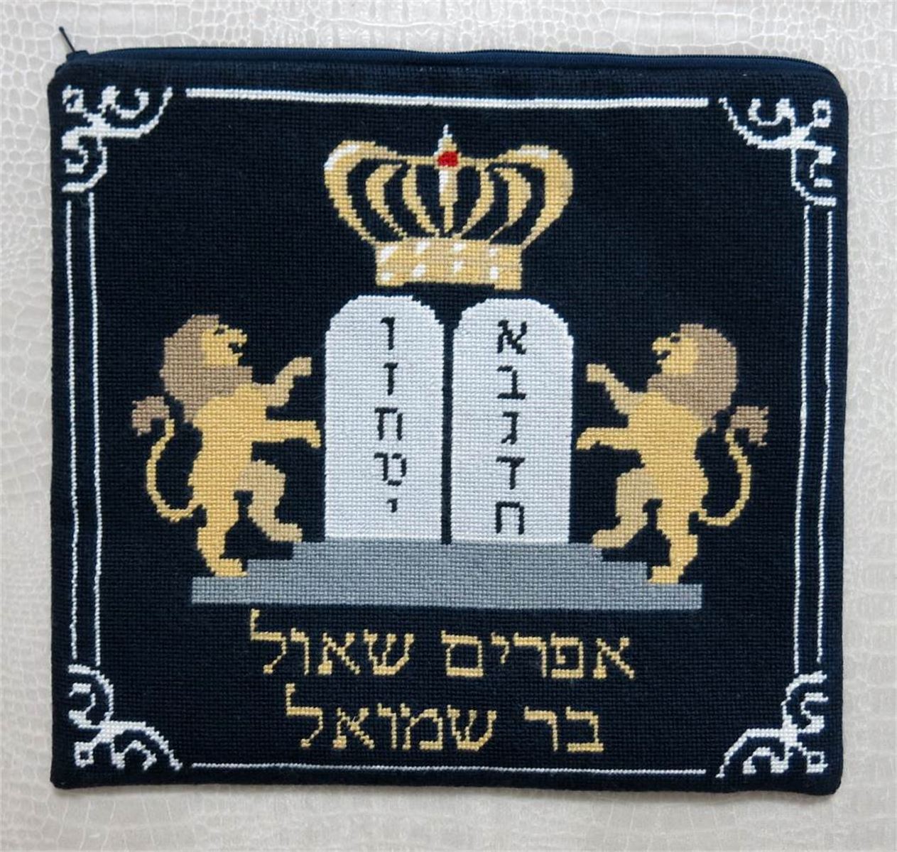 Design with tablets in the center, two lions on either side, and a crown above all. The name is on the bottom. Many boys and men with the name "Ari" like to have lions on their tallit bags. Ari is a popular Jewish boys' name, and it means lion in Hebrew.