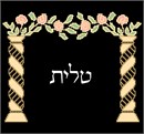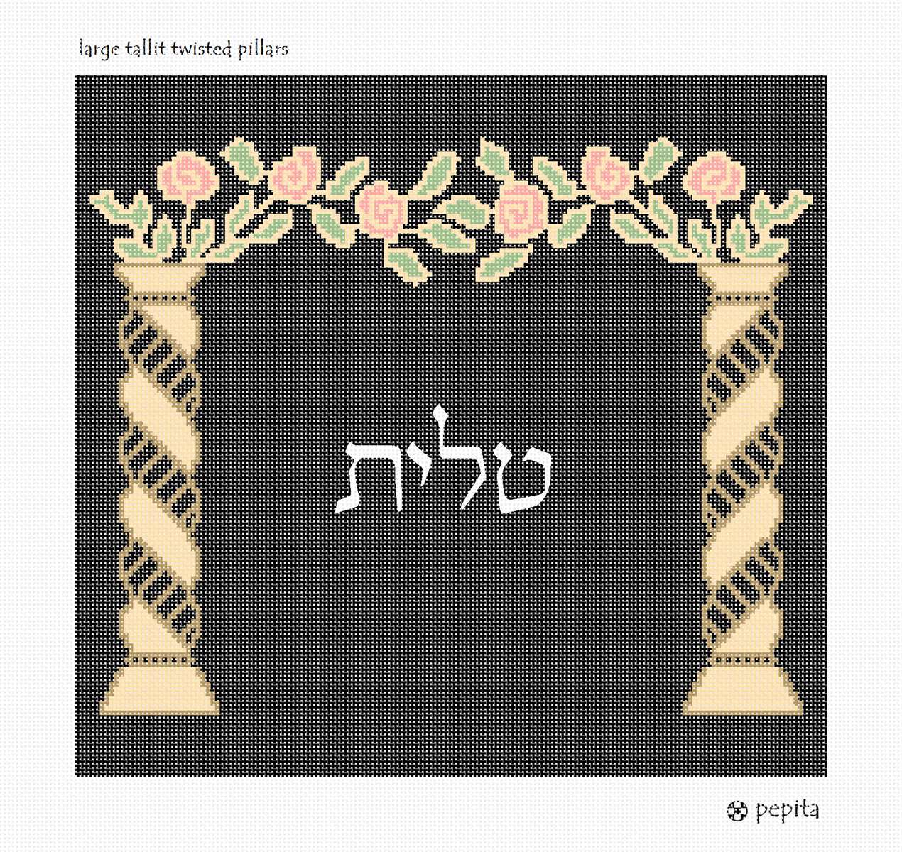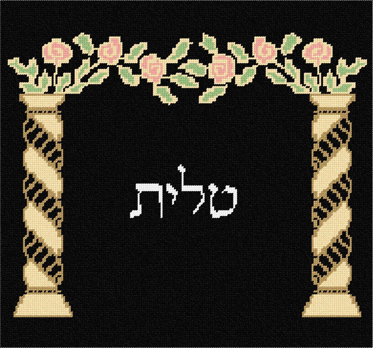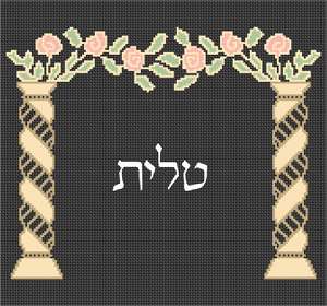 Fancy pillars stand opposite one another, sculpted as two ropes twisting around and around. The top is a medley of gold-green and pink florals. The name in Hebrew appears in the center of the design.