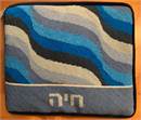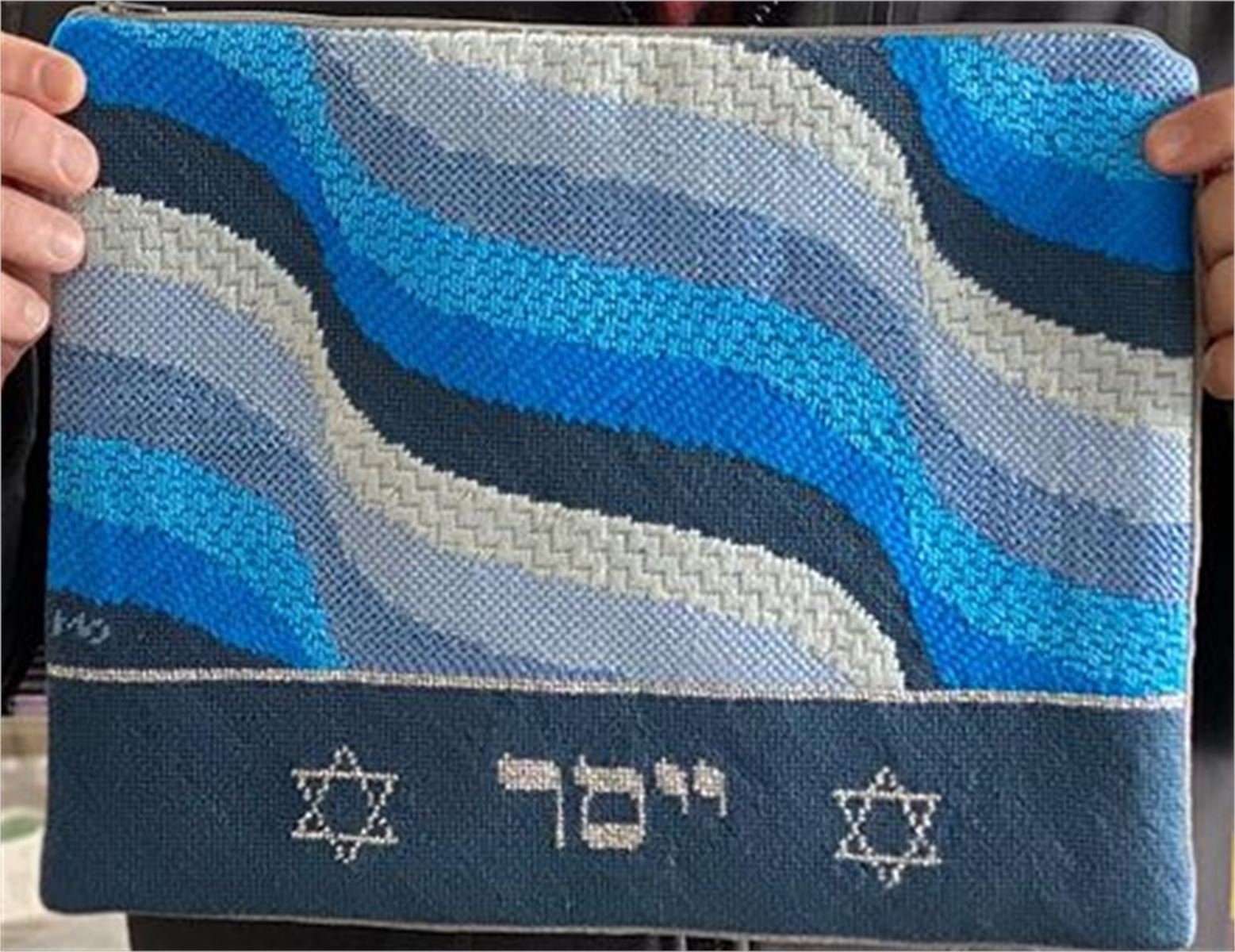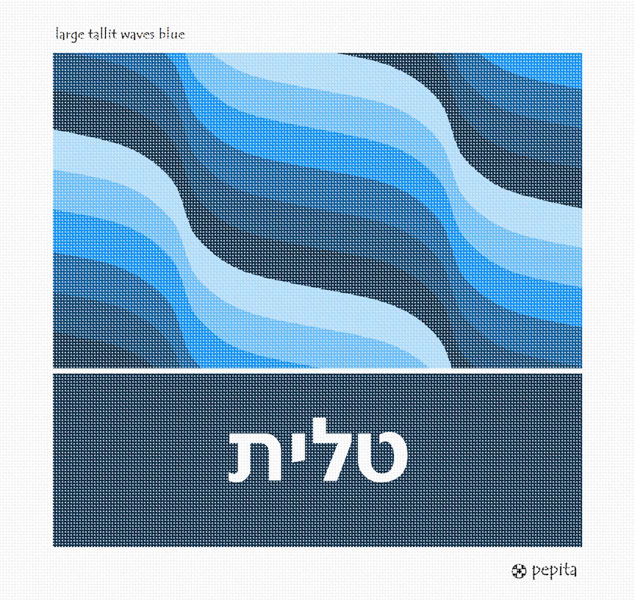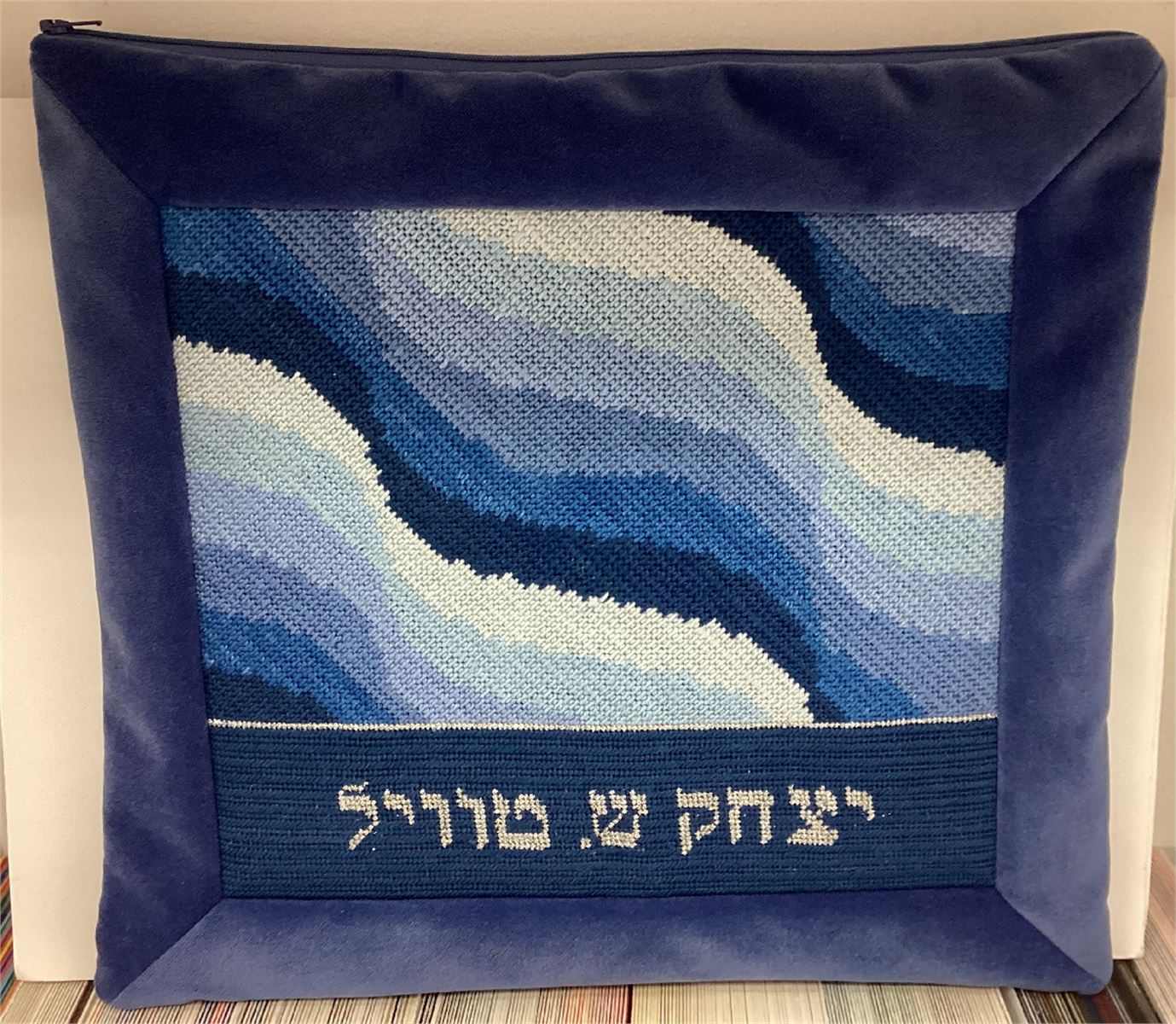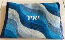 Tallit bag wave pattern in shades of blue. You stitch the front. After it is completely stitched, it is sent to a professional finisher who adds a lining, back, and matching zipper. See coordinating siddur cover.