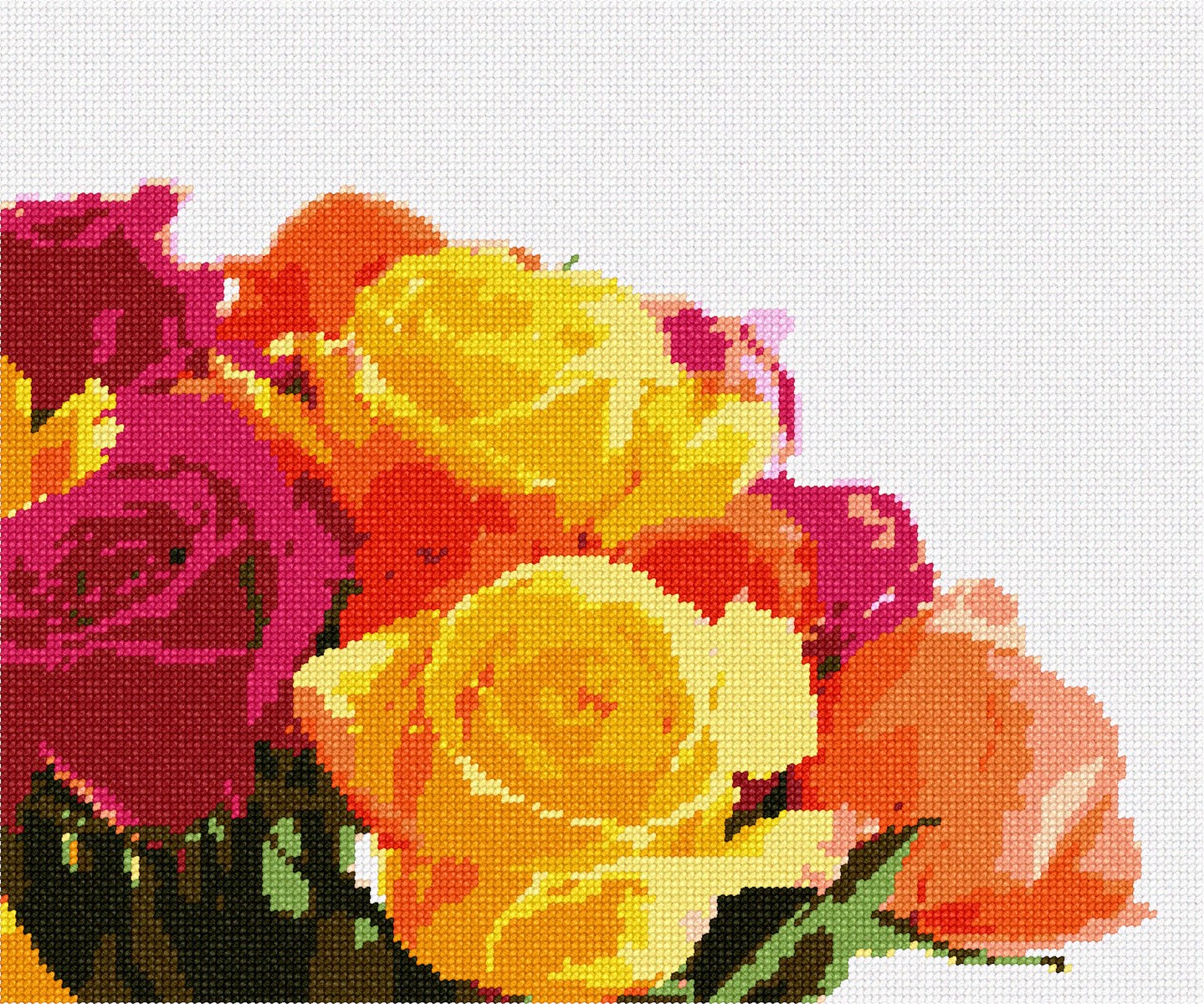 A bundle of roses. Yellows, oranges and fuchsia petals blend together to form the perfect bouquet. Red roses symbolize love and romance. Pink roses symbolize gratitude, grace, admiration, and joy. Orange roses symbolize enthusiasm and passion. Yellow roses symbolize friendship. White roses symbolize innocence and purity.