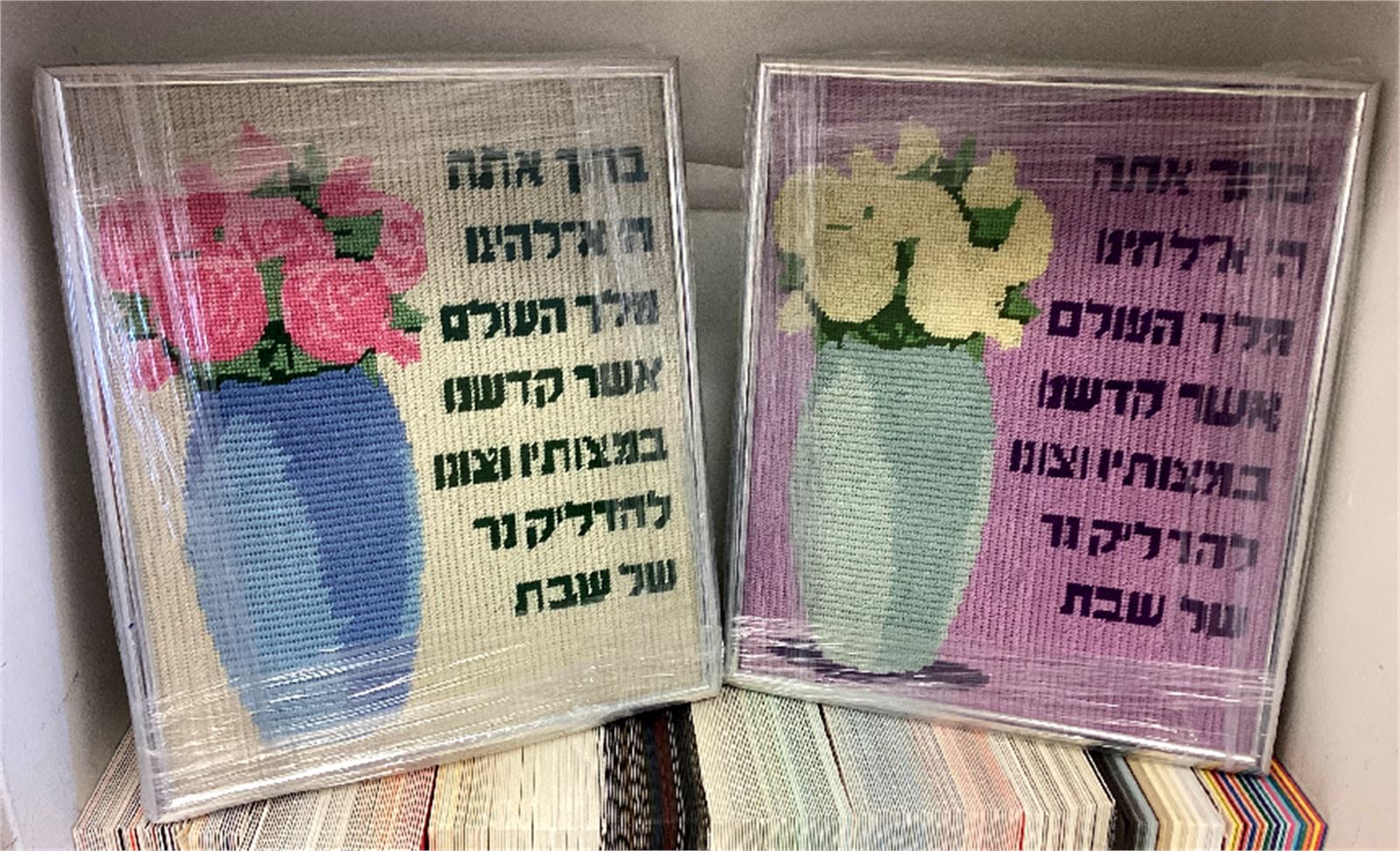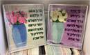 This is the Hebrew blessing for candlelight that takes place every Friday evening eighteen minutes prior to sunset. It's a special and sacred time for the Jewish woman when she lights the candles every Friday night to usher in the Shabbos. It is a time when she can pray for anything, and her prayers are heard by the One Above. This contemporary design includes flowers in honor of Shabbos.