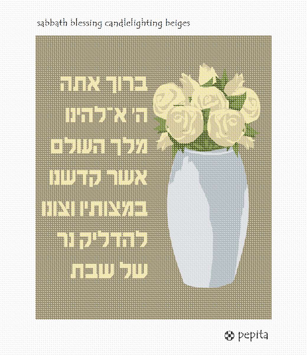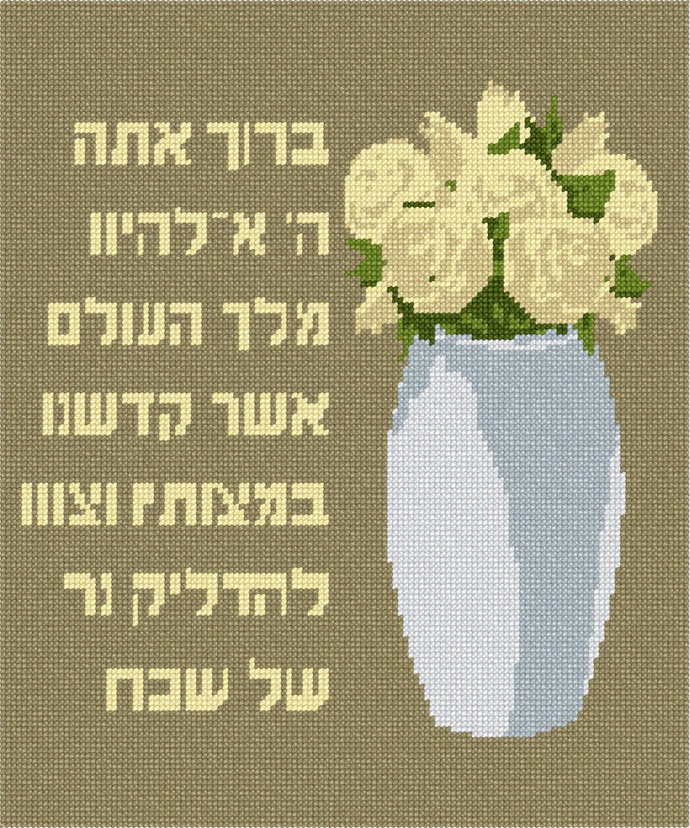 This is the Hebrew blessing for candlelight that takes place every Friday evening eighteen minutes prior to sunset. It's a special and sacred time for the Jewish woman when she lights the candles every Friday night to usher in the Shabbos. It is a time when she can pray for anything, and her prayers are heard by the One Above. This contemporary design includes flowers in honor of Shabbos. This design is available in other colors and variations.
