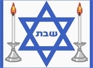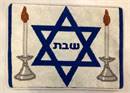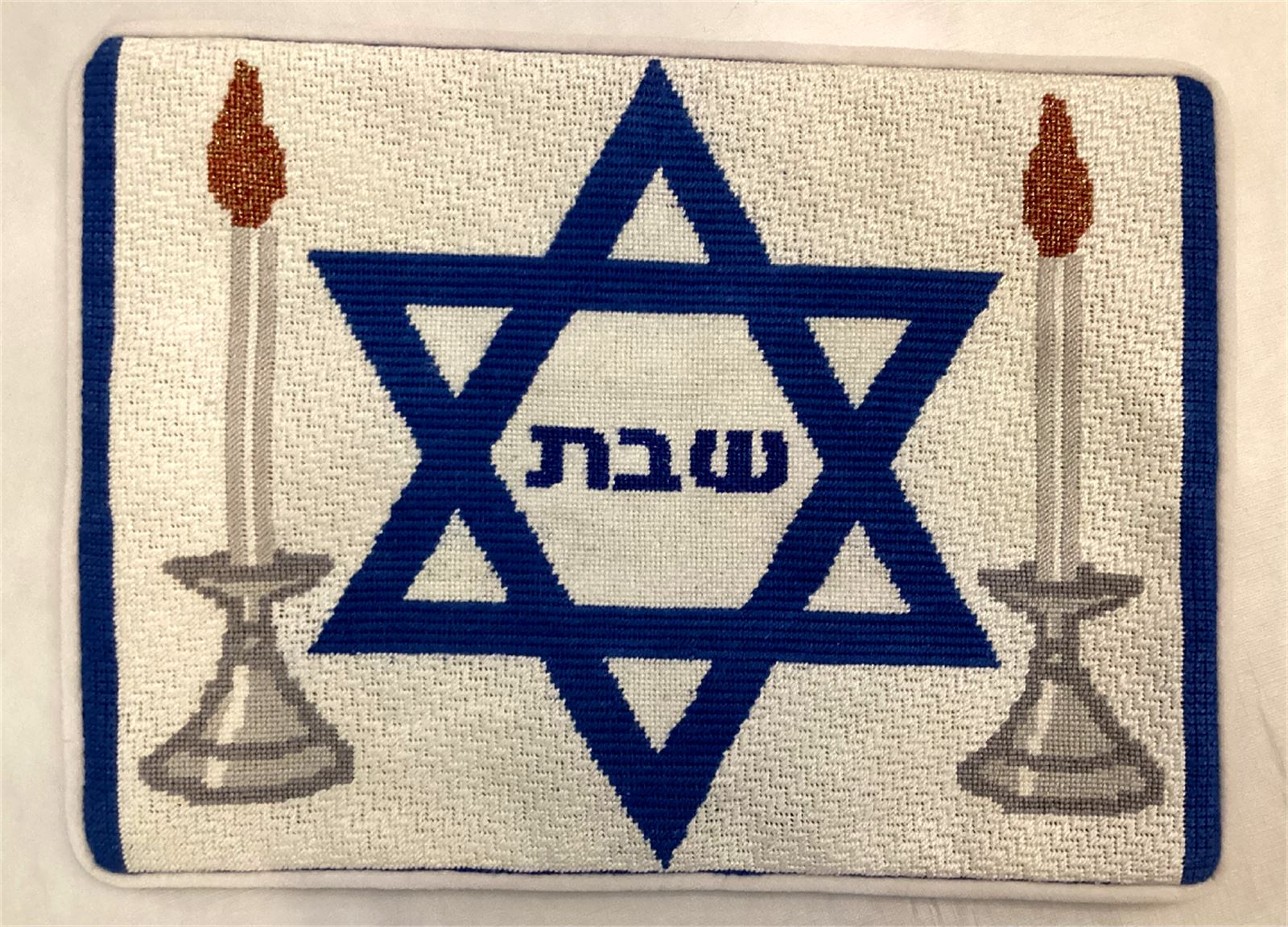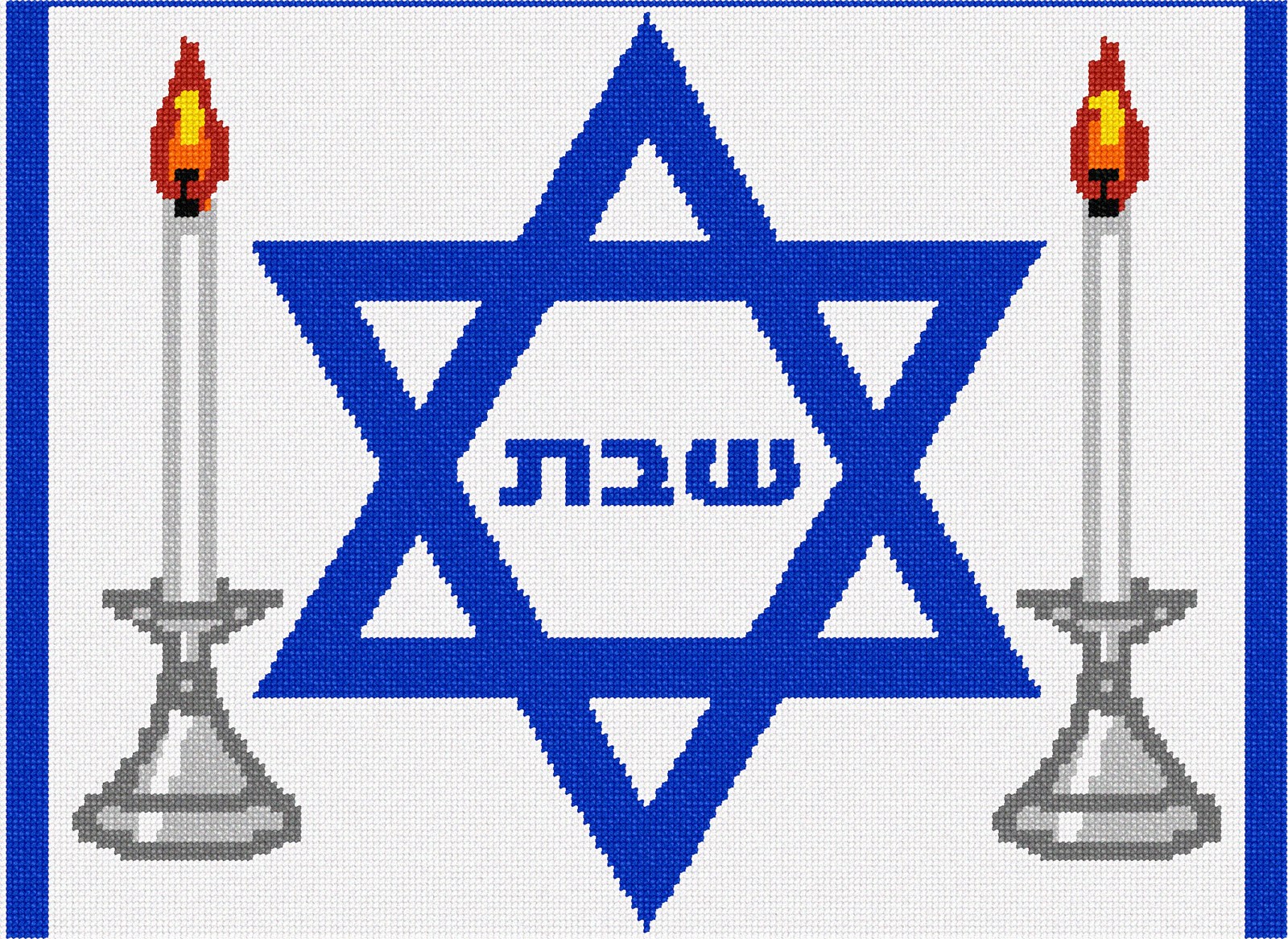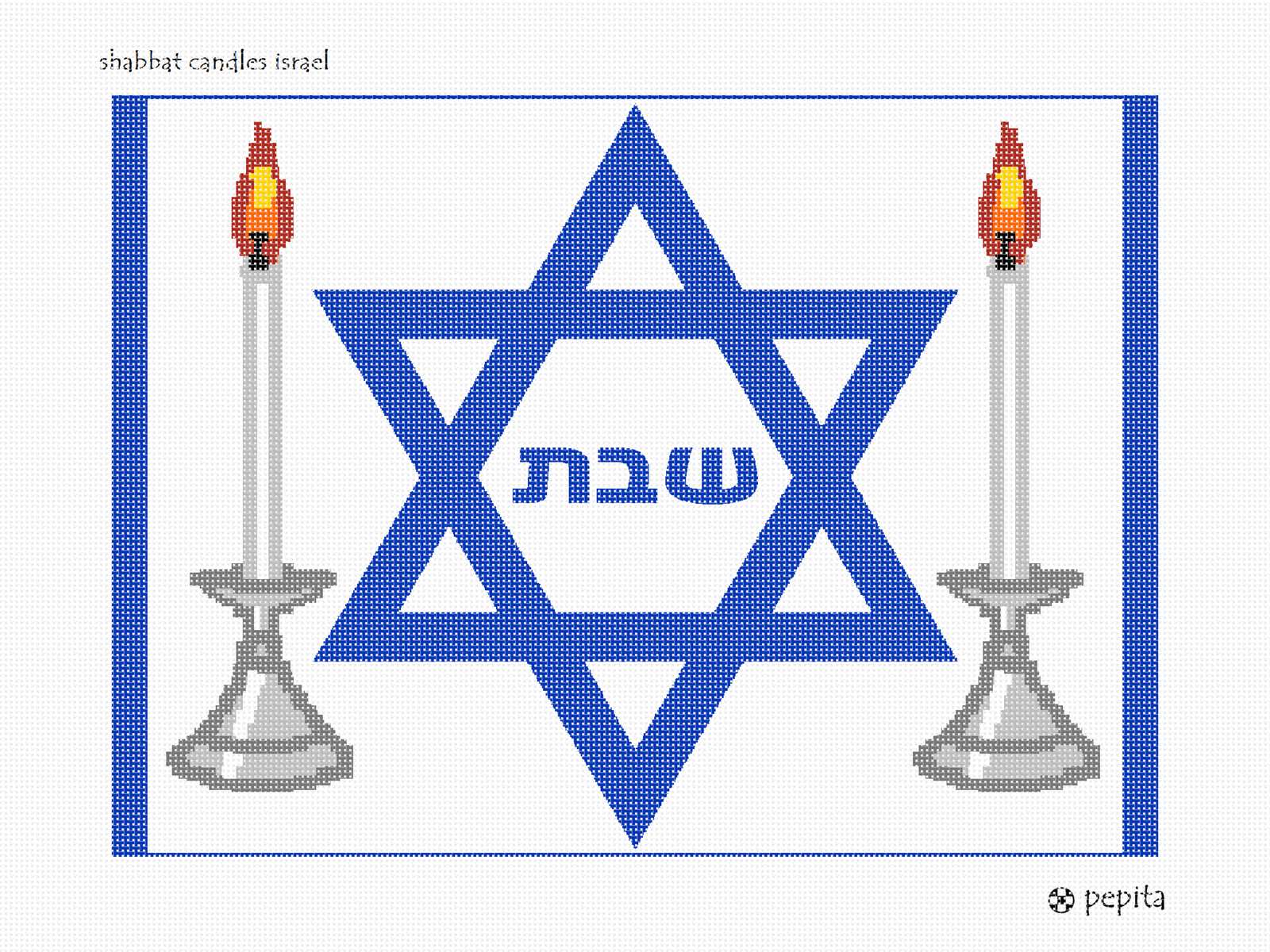 Large Star of David in the Israeli Flag color scheme and theme. Two Shabbat candlesticks are on either side of the star. This can be needlepointed as a wall hanging or a challah cover. It is a beautiful reminder about the significance of light Shabbat candles on Friday night eighteen minutes before sunset. Let's try to light candles every week as a merit for peace.