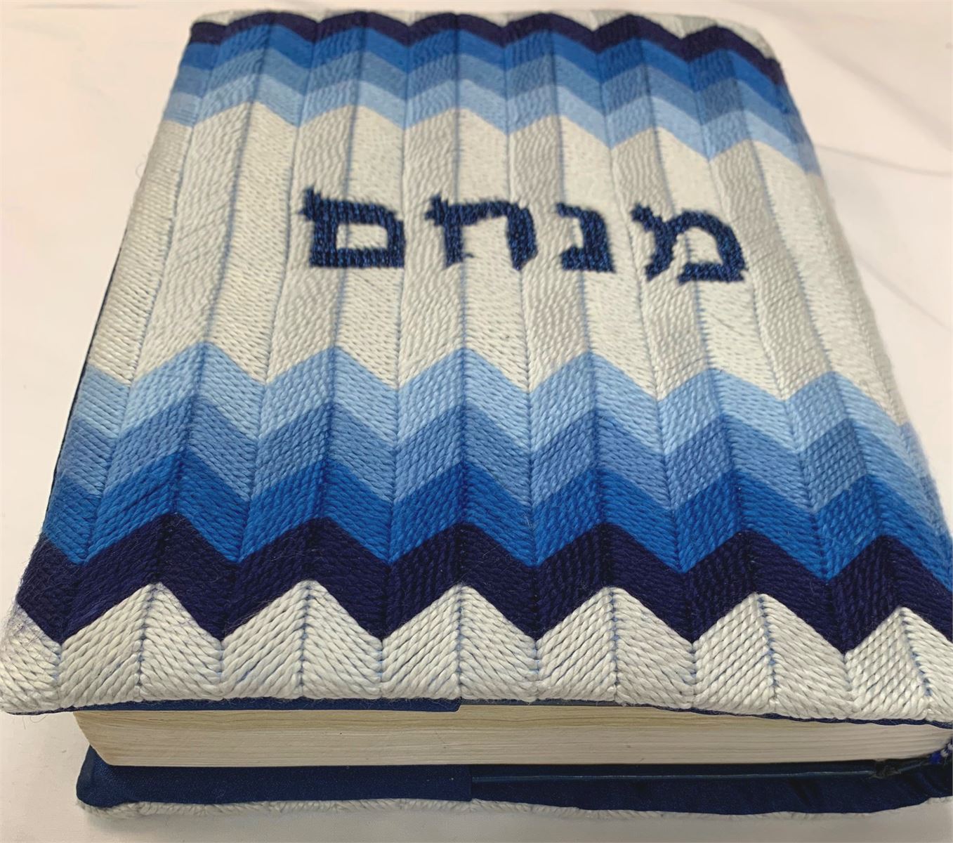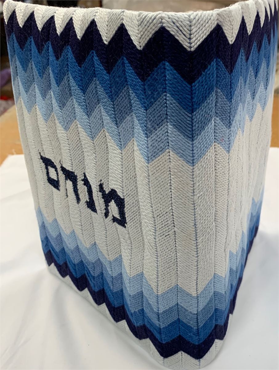 Siddur cover in green chevron pattern. Many mothers and grandmothers stitch tefillin and tallit bags for the boys. They stitch siddur covers for the girls. Many schools have siddur ceremonies where the siddur cover is custom made.