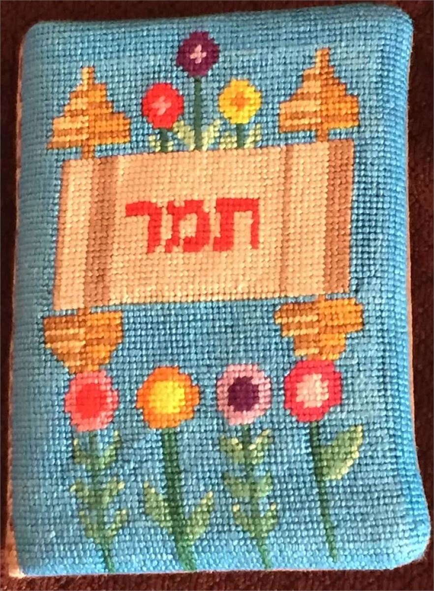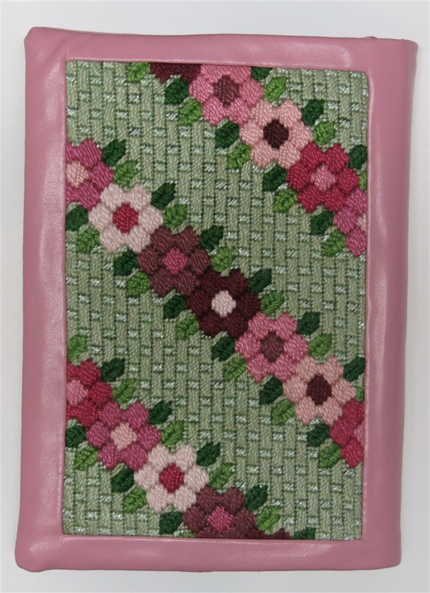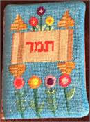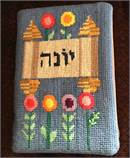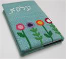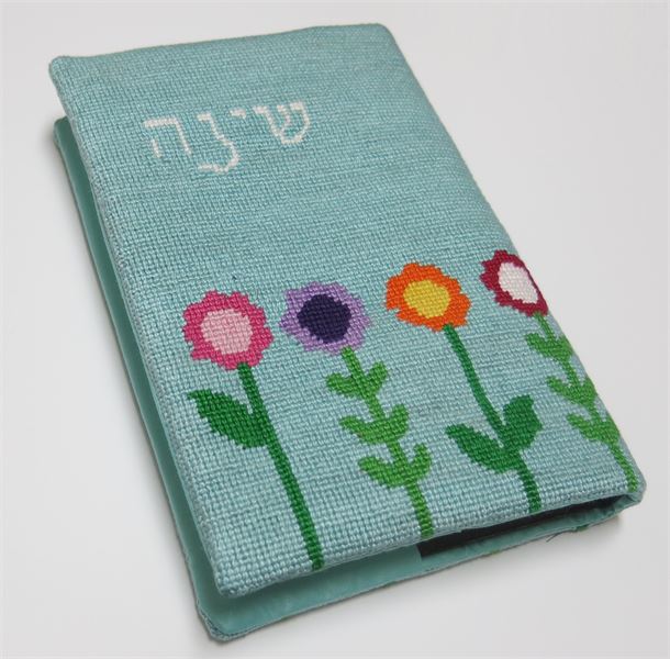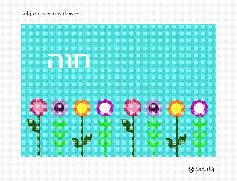 A book cover with a row of flowers growing. Perfect to stitch for a siddur ceremony. Many mothers and grandmothers stitch tefillin and tallit bags for the boys. They stitch siddur covers for the girls. Many schools have siddur ceremonies where the siddur cover is custom made.
