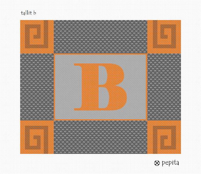 A bright tallit bag that can be customized with any initial. This is a modern, neat design. You stitch the front. After it is completely stitched, it is sent to a professional finisher who adds a lining, back, and matching zipper.There is a matching tefillin bag available for this design.