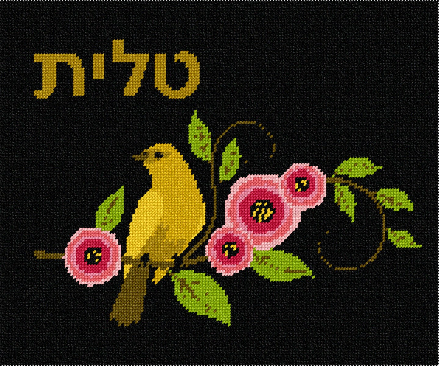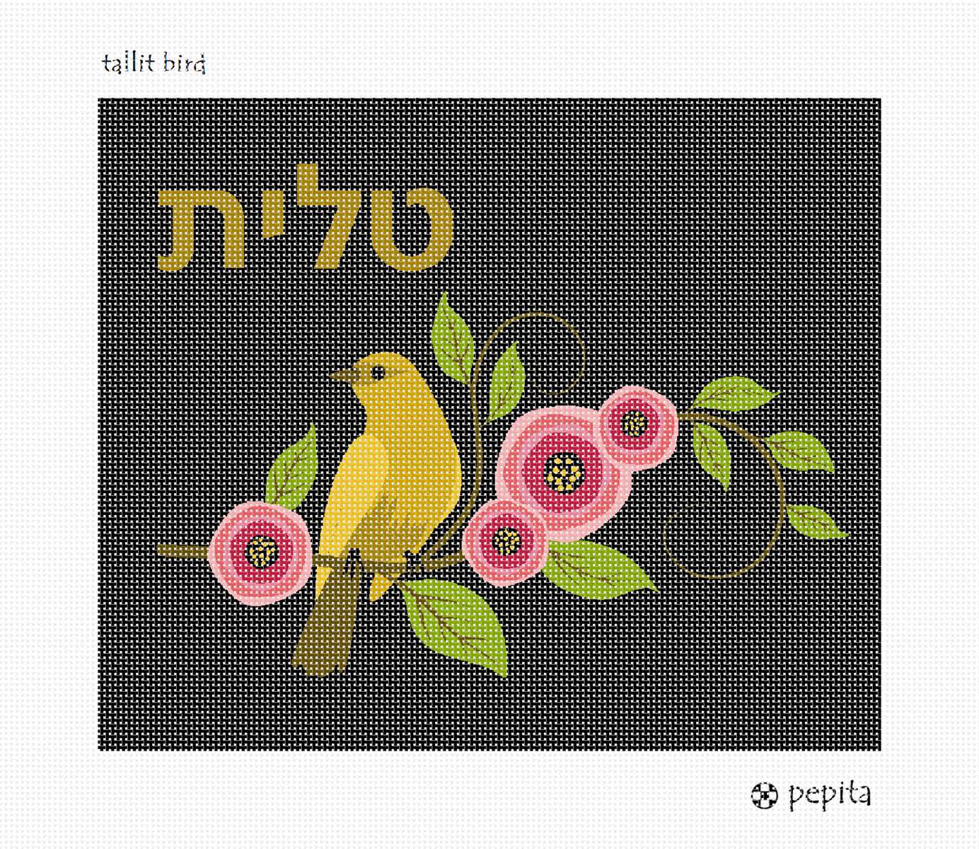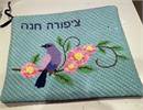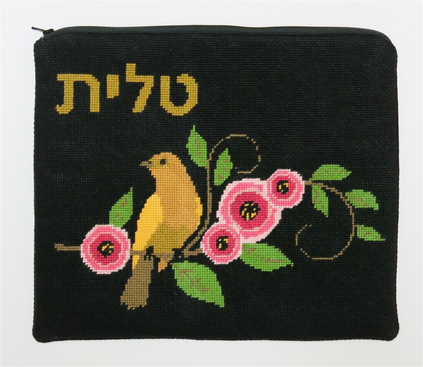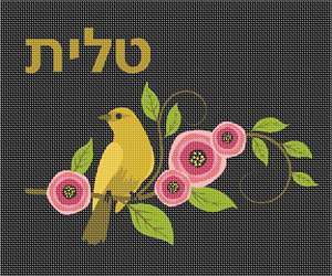 Tallit bag design adorned with a lovely bird and flowers. You stitch the front. After it is completely stitched, it is sent to a professional finisher who adds a lining, back, and matching zipper. See coordinating siddur cover design.