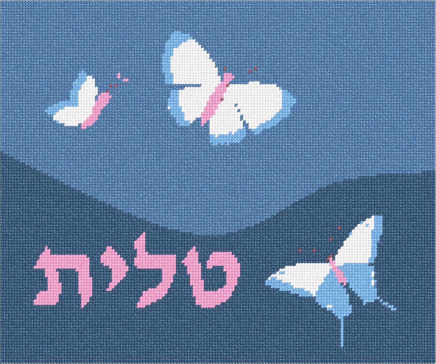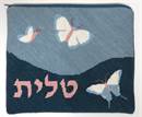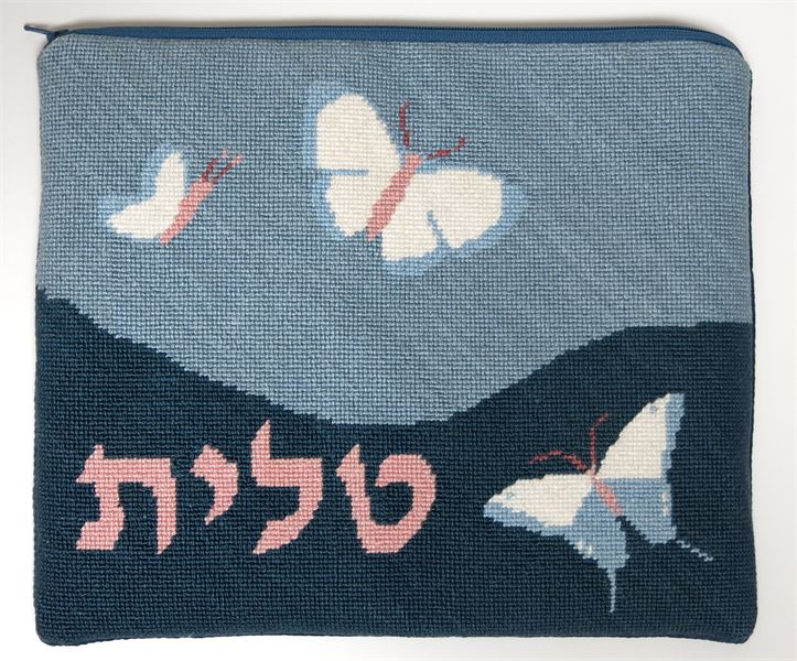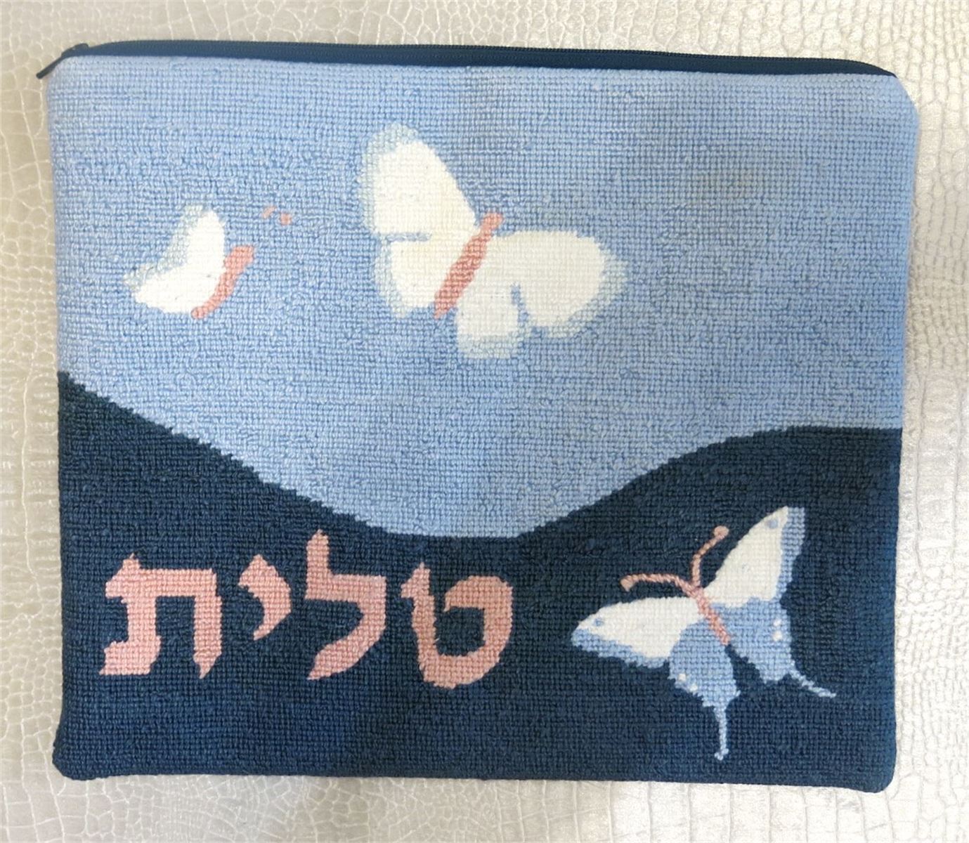A tallit bag to needlepoint with butterflies in shades of blue. You stitch the front. After it is completely stitched, it is sent to a professional finisher who adds a lining, back, and matching zipper. Butterflies are deep and powerful representations of life. Around the world, people view the butterfly as representing endurance, change, hope, and life.