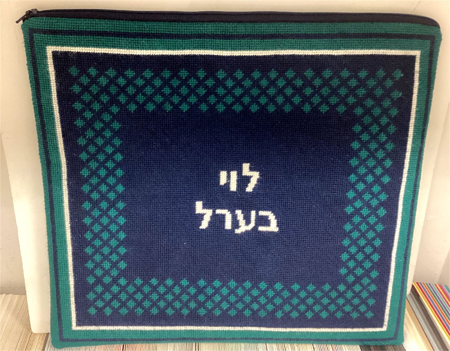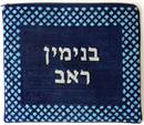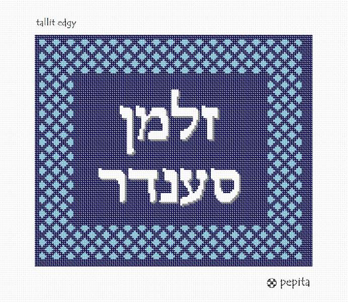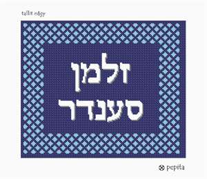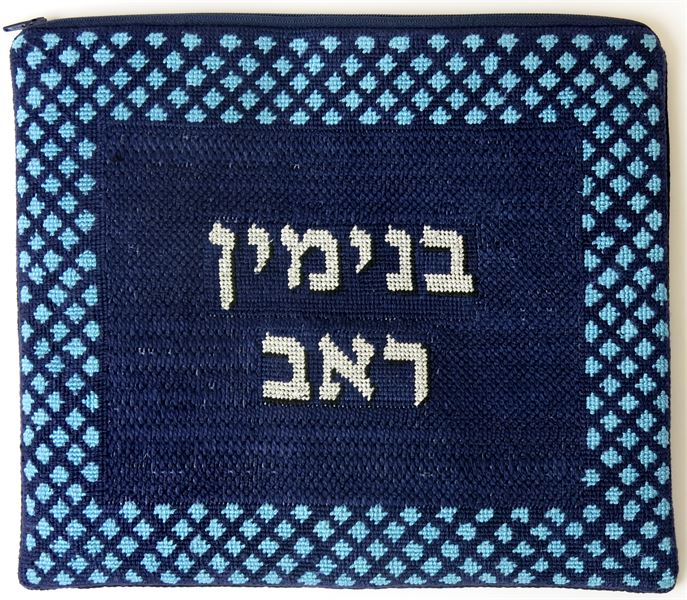 Borders are composed of a repeating mini-design, all in shades of blue. Geometrics are very vogue in tallit and tefillin bags today. You stitch the front. After it is completely stitched, it is sent to a professional finisher who adds a lining, back, and matching zipper.