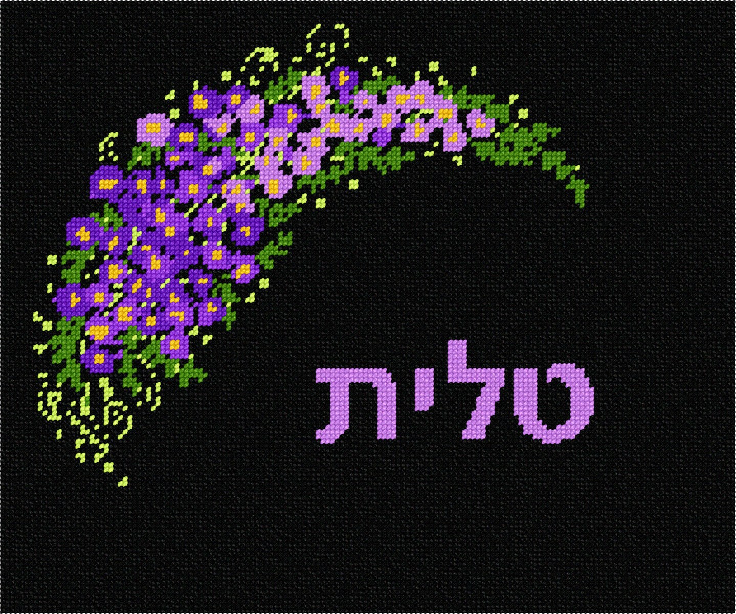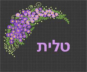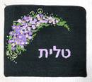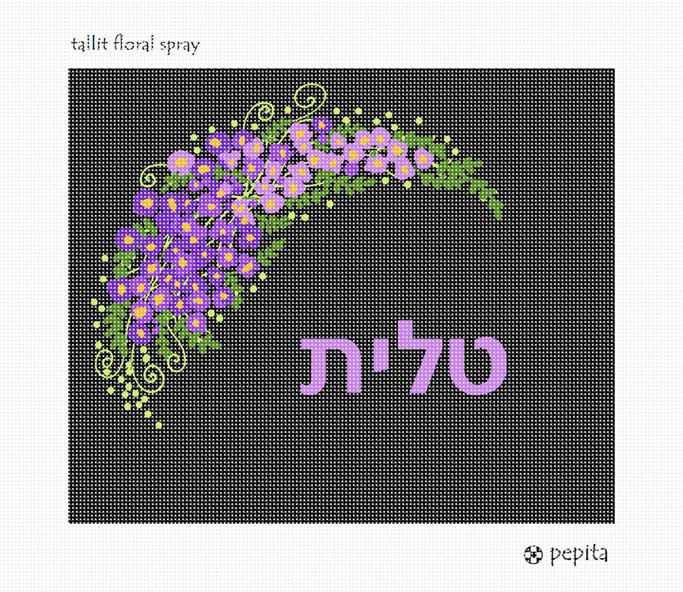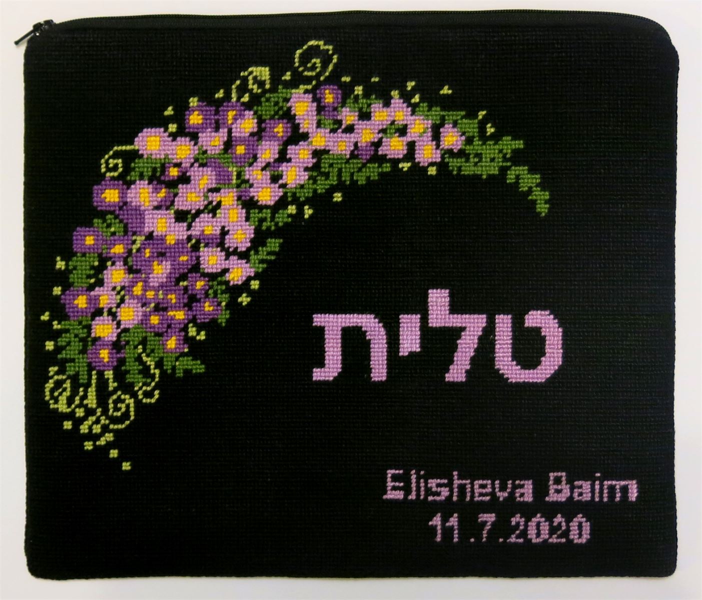Spray of purple flowers on this lovely tallit bag. You stitch the front. After it is completely stitched, it is sent to a professional finisher who adds a lining, back, and matching zipper. See coordinating challah cover and siddur cover.