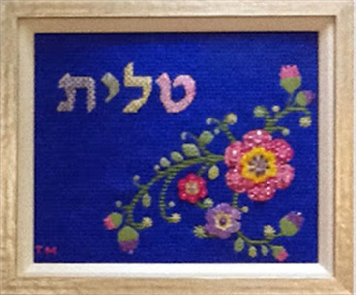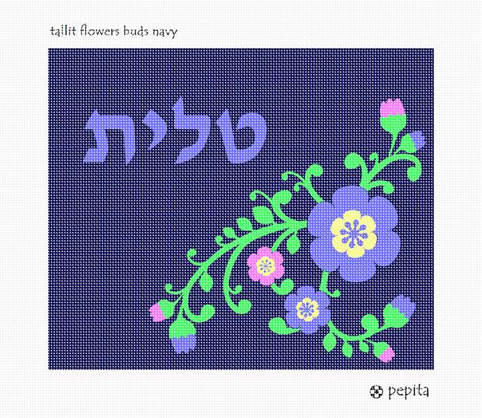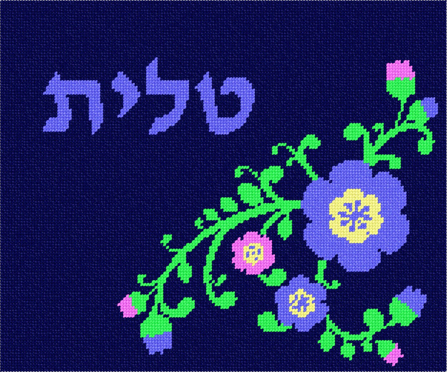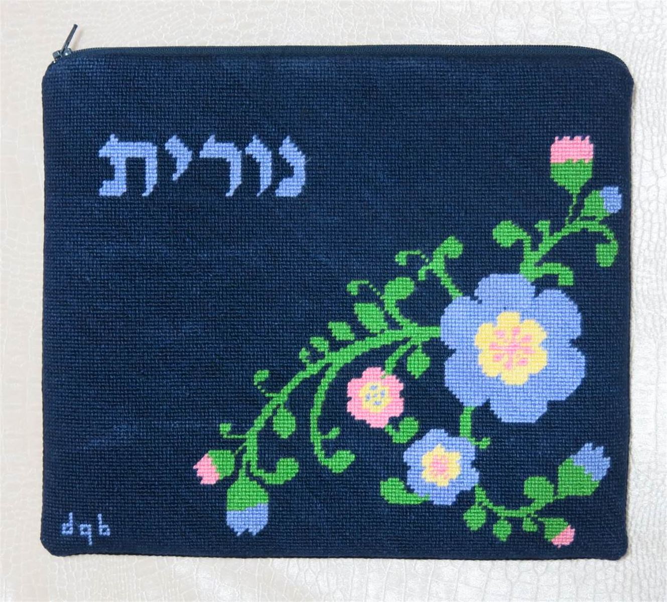 Tallit designed with a floral motif in shades of blue and pink against a solid navy background. This is a modern, neat design. You stitch the front. After it is completely stitched, it is sent to a professional finisher who adds a lining, back, and matching zipper. There is a matching siddur cover available for this design.
