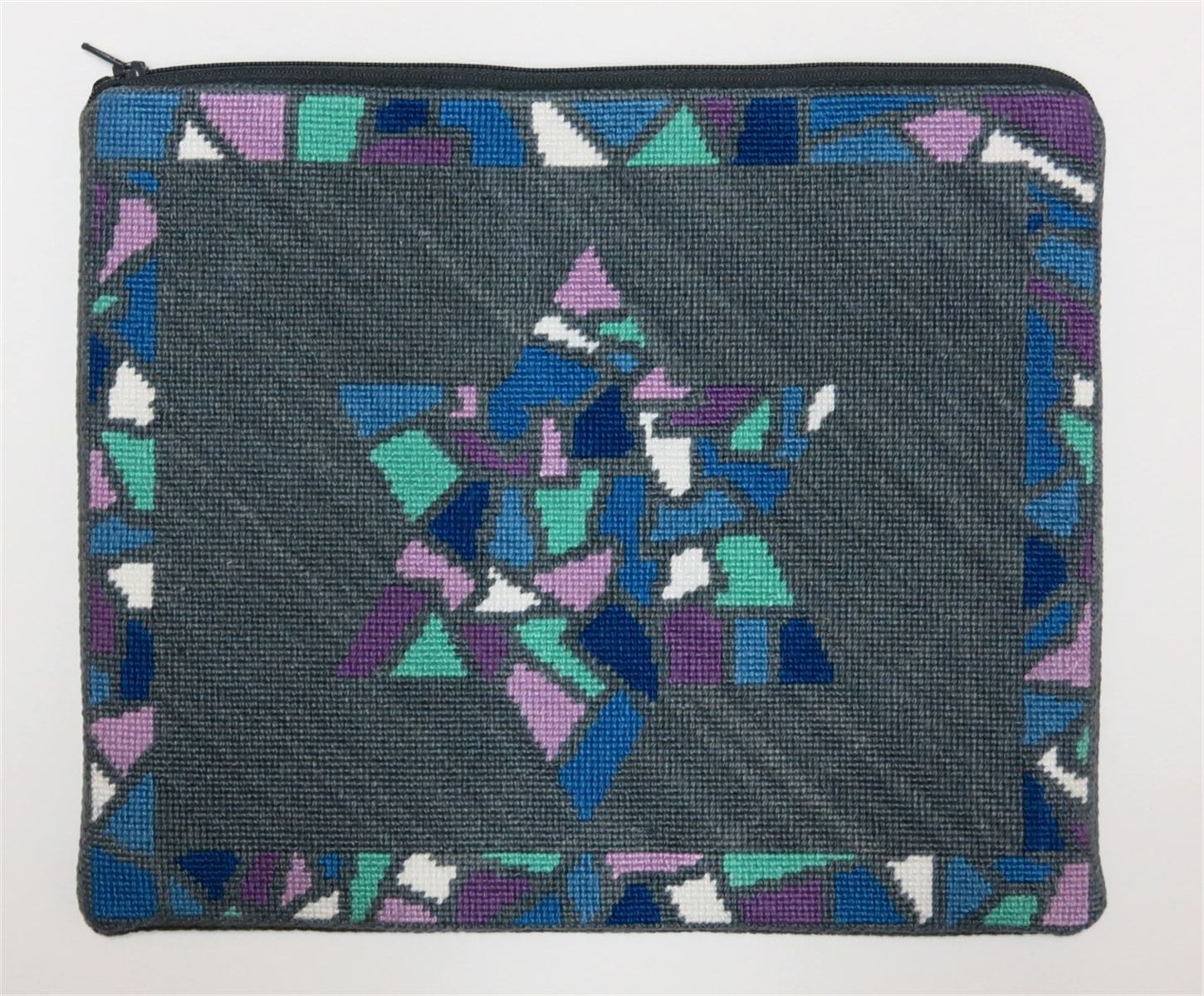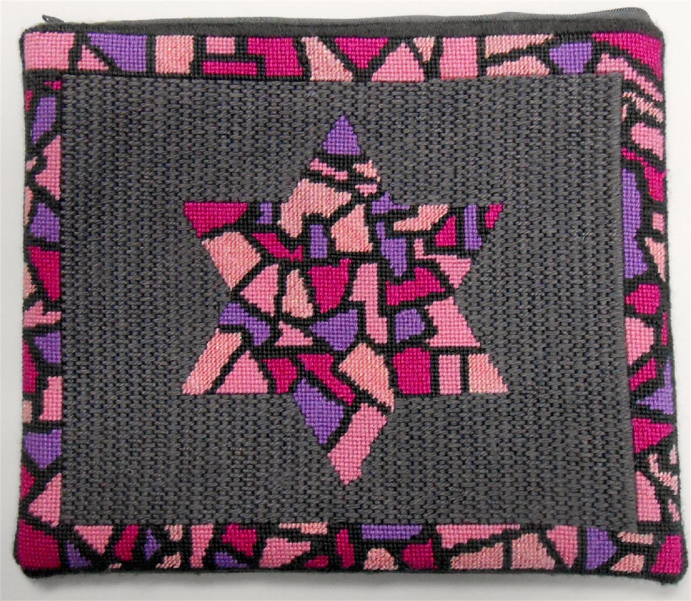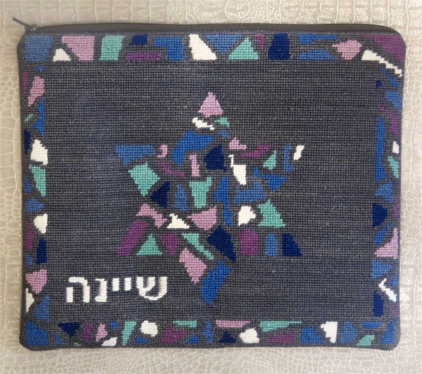 Tallit in stained glass grey variation. Stained glass design is very popular on many Judaica items.The Star of David or Magen David (literally, Shield of David), as it is referred to in Hebrew, is the most common symbol for expressing Jewish identity today. The Hebrew name for the symbol – a hexagram formed by two overlapping triangles, one pointed upward and the other downward – comes from its supposed resemblance to King David’s shield. However, use of the Star of David as a Jewish symbol only became widespread in 17th-century Europe, when it was used displayed on synagogues to identify them as Jewish places of worship. You stitch the front. After it is completely stitched, it is sent to a professional finisher who adds a lining, back, and matching zipper.