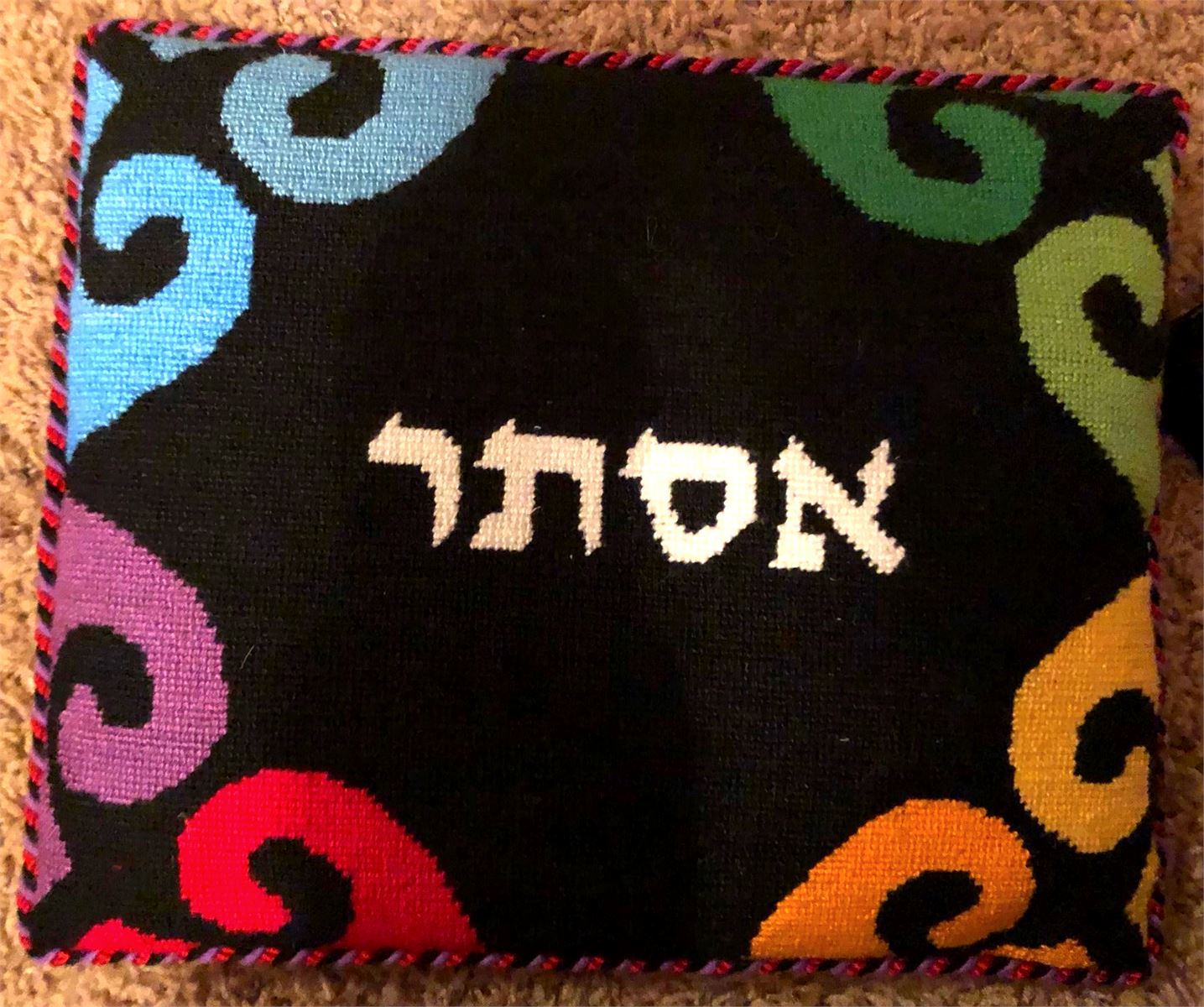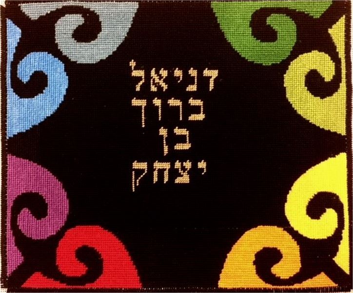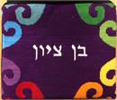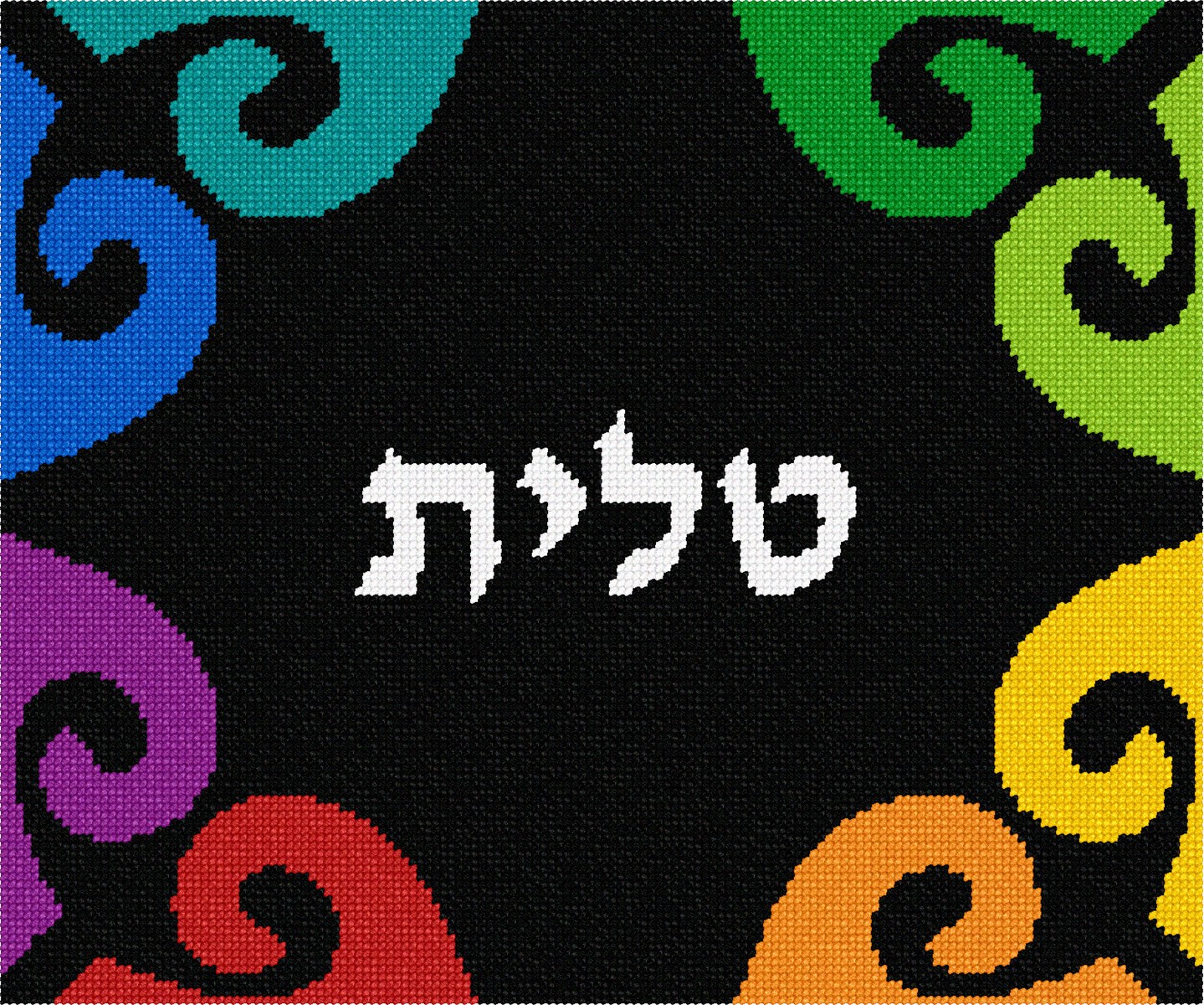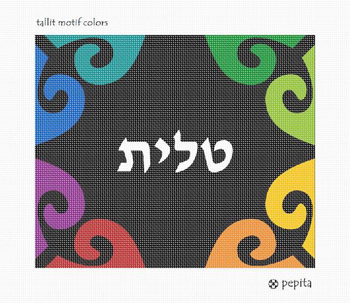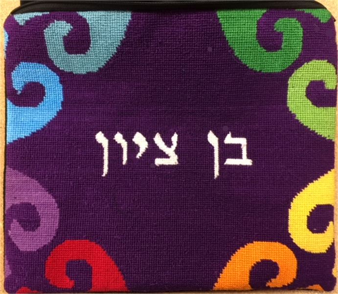 Enjoy the splash of bold colors. Geometrics are very vogue in tallit and tefillin bags today. You stitch the front. After it is completely stitched, it is sent to a professional finisher who adds a lining, back, and matching zipper. See coordinating tefillin bag.