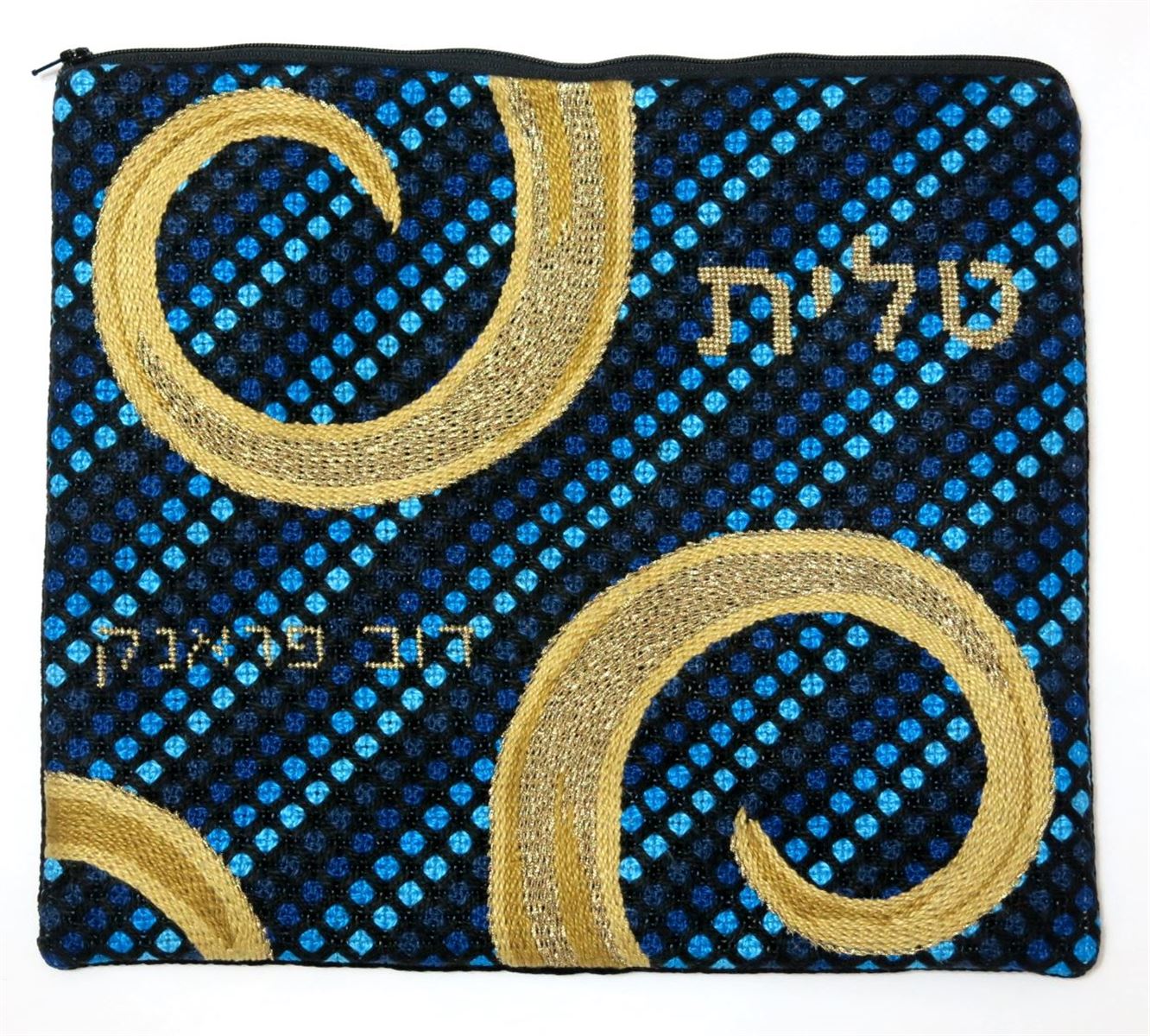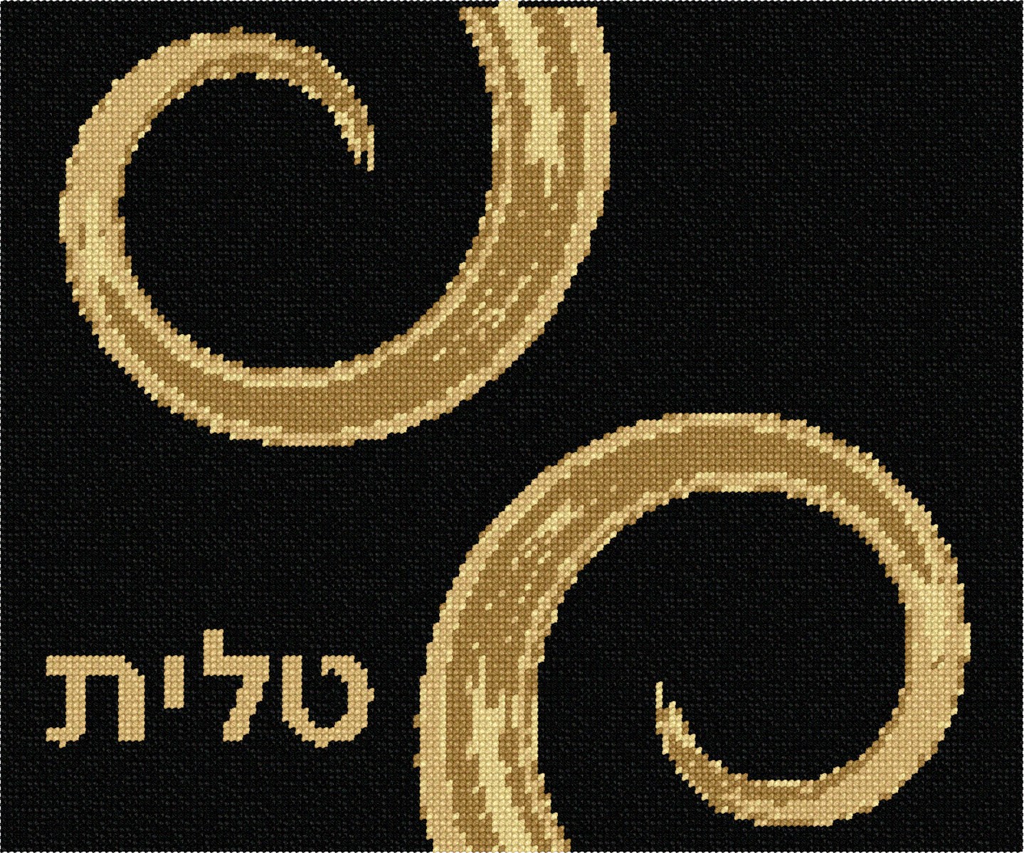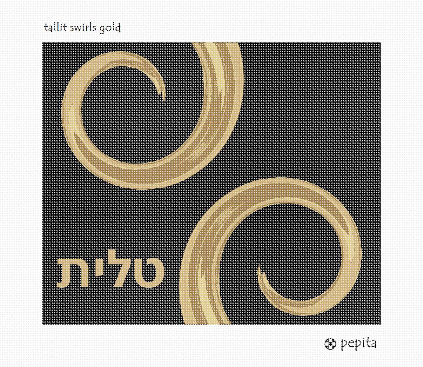 Tallit bag needlepoint with two fold swirls dominating the front. You stitch the front. After it is completely stitched, it is sent to a professional finisher who adds a lining, back, and matching zipper.