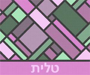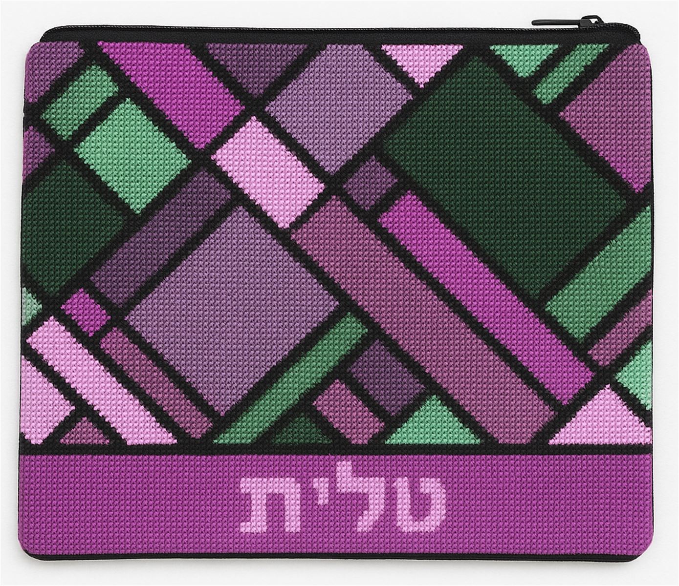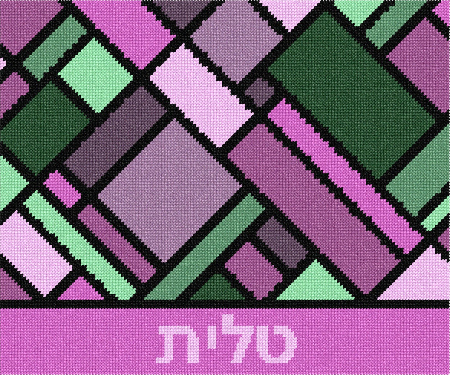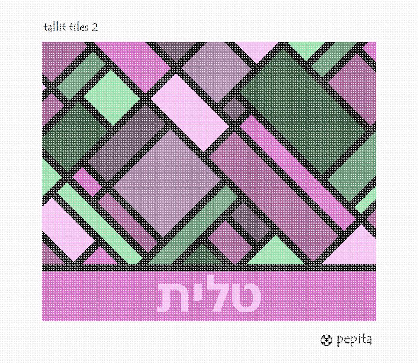 A tallit needlepoint for the front of a tallit bag in a tile pattern. Cool colors!