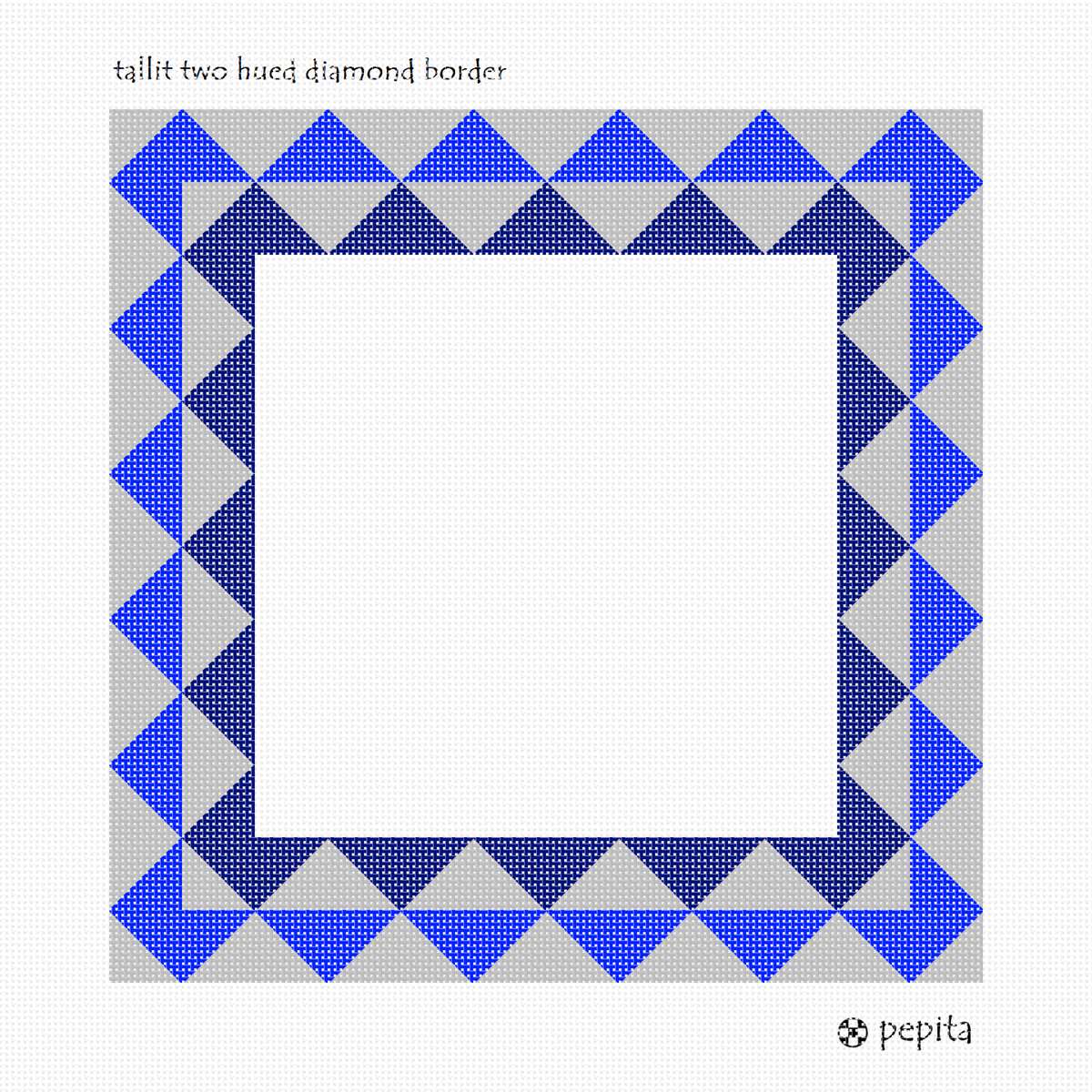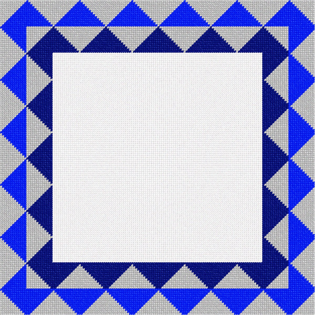 Two-hues diamond shapes surround a white center area, suitable for a name or the word Tallit. You stitch the front. After it is completely stitched, it is sent to a professional finisher who adds a lining, back, and matching zipper.