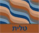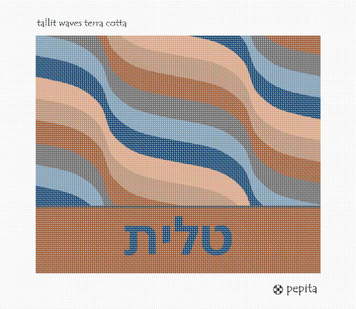 Tallit bag wave pattern in shades of earth tone browns and wedgewood blue. You stitch the front. After it is completely stitched, it is sent to a professional finisher who adds a lining, back, and matching zipper. See coordinating siddur cover.