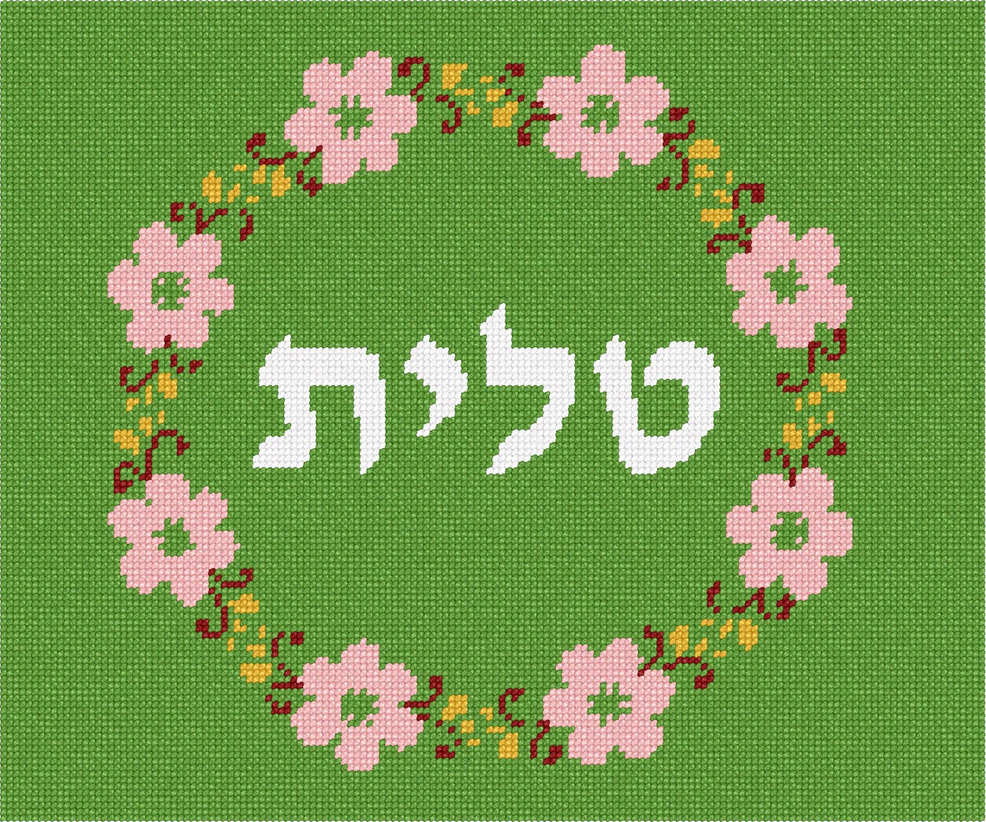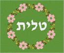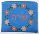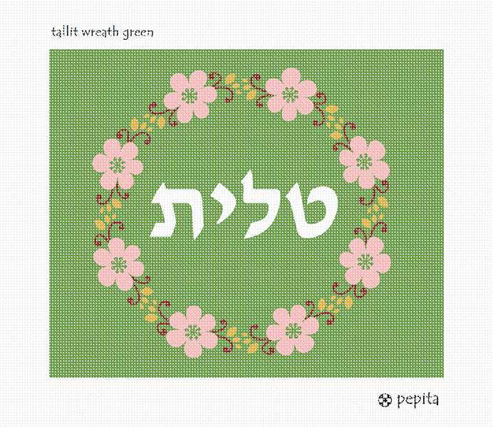 Tallit bag design framed with a flowering wreath. This is a modern, neat design. You stitch the front. After it is completely stitched, it is sent to a professional finisher who adds a lining, back, and matching zipper. There is a matching siddur cover available for this design.