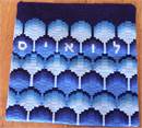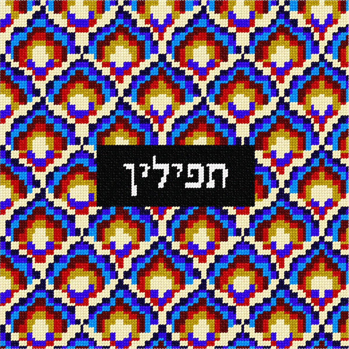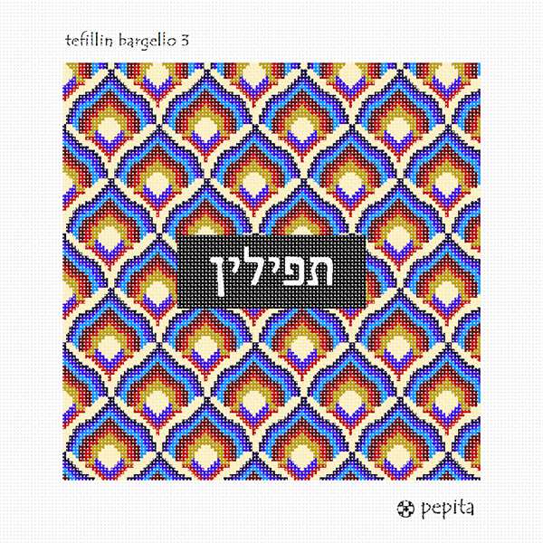 Black box with name against patterned background in contrasting colors. See matching tallit bag. Geometrics are very vogue in tallit and tefillin bags today. You stitch the front. After it is completely stitched, it is sent to a professional finisher who adds a lining, back, and matching zipper. Mazel Tov on the Bar Mitzvah! Bargello is a type of needlepoint embroidery consisting of upright flat stitches laid in a mathematical pattern to create motifs. The name originates from a series of chairs found in the Bargello palace in Florence, which have a "flame stitch" pattern. Traditionally, Bargello was stitched in wool on canvas. Embroidery done this way is remarkably durable. It is well suited for use on pillows, upholstery and even carpets, but not for clothing. In most traditional pieces, all stitches are vertical with stitches going over two or more threads.