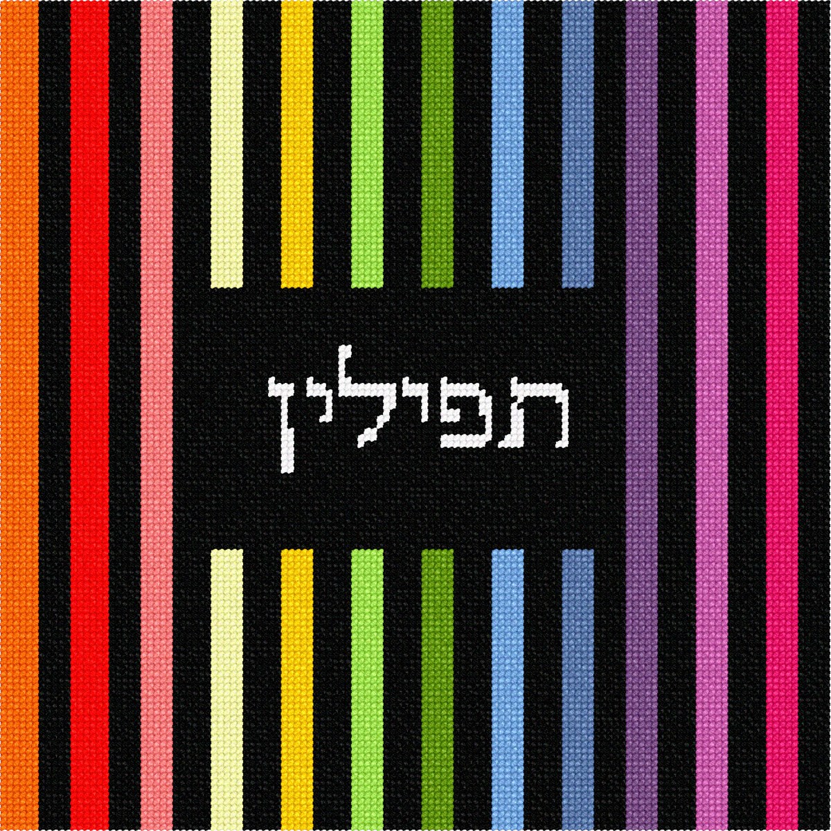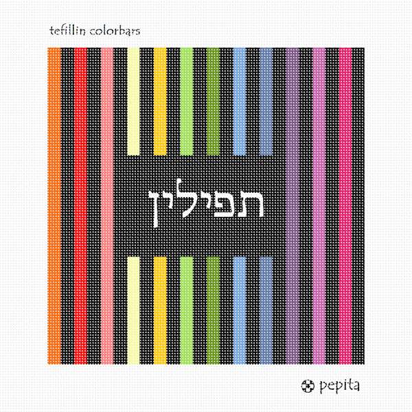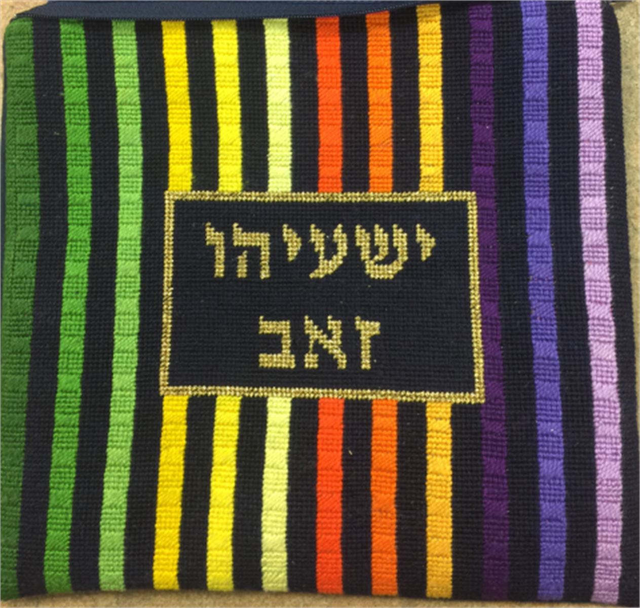 Alternating black and colorful vertical bars. Are you a stripes person? This design is for you. See matching tallit bag. Geometrics are very vogue in tallit and tefillin bags today. You stitch the front. After it is completely stitched, it is sent to a professional finisher who adds a lining, back, and matching zipper. Mazel Tov on the Bar Mitzvah!