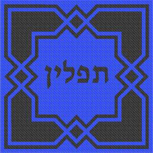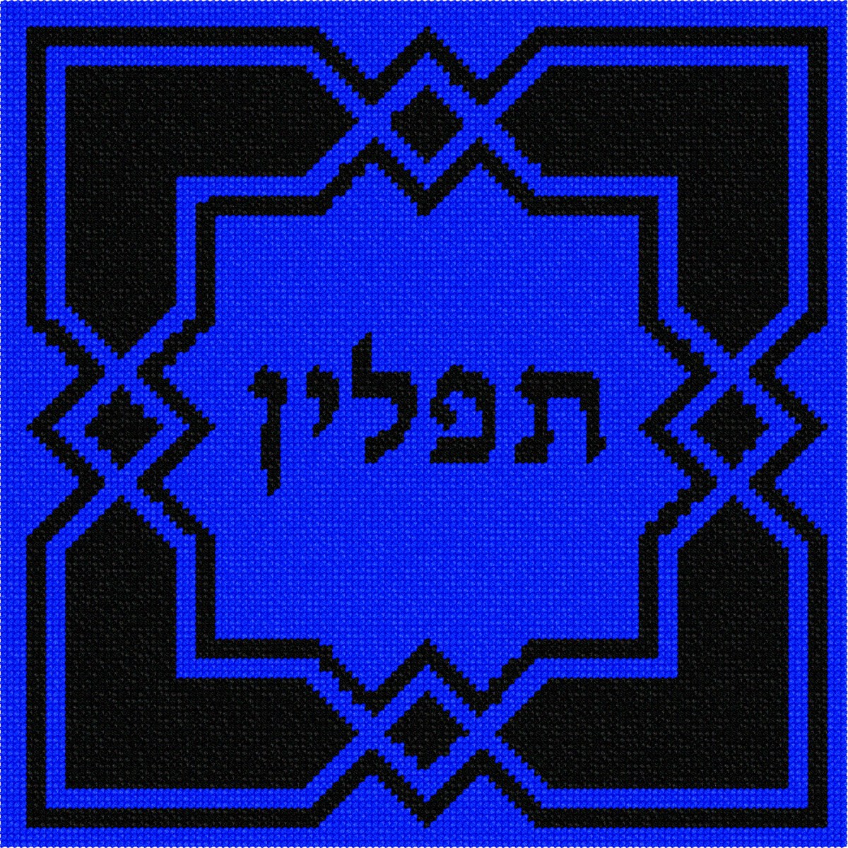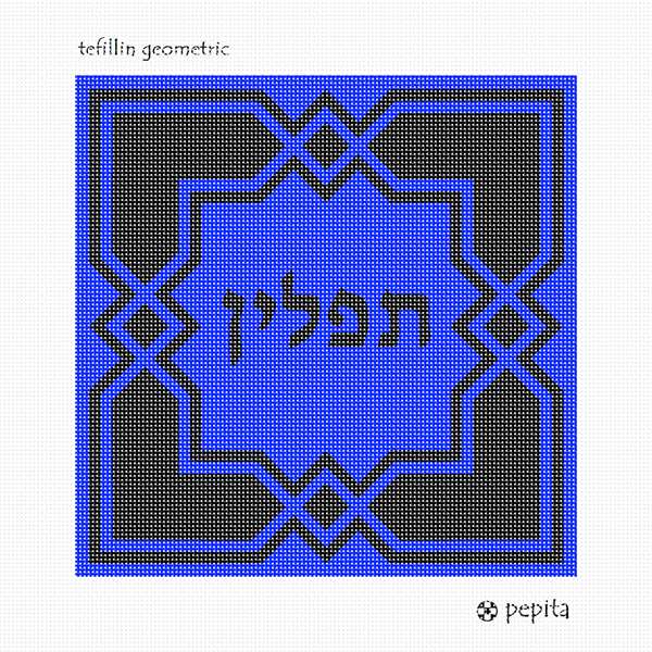 Geometric is in style. This royal blue and black tefillin design is bright and beautiful. See matching tallit bag. Geometrics are very vogue in tallit and tefillin bags today. You stitch the front. After it is completely stitched, it is sent to a professional finisher who adds a lining, back, and matching zipper.
