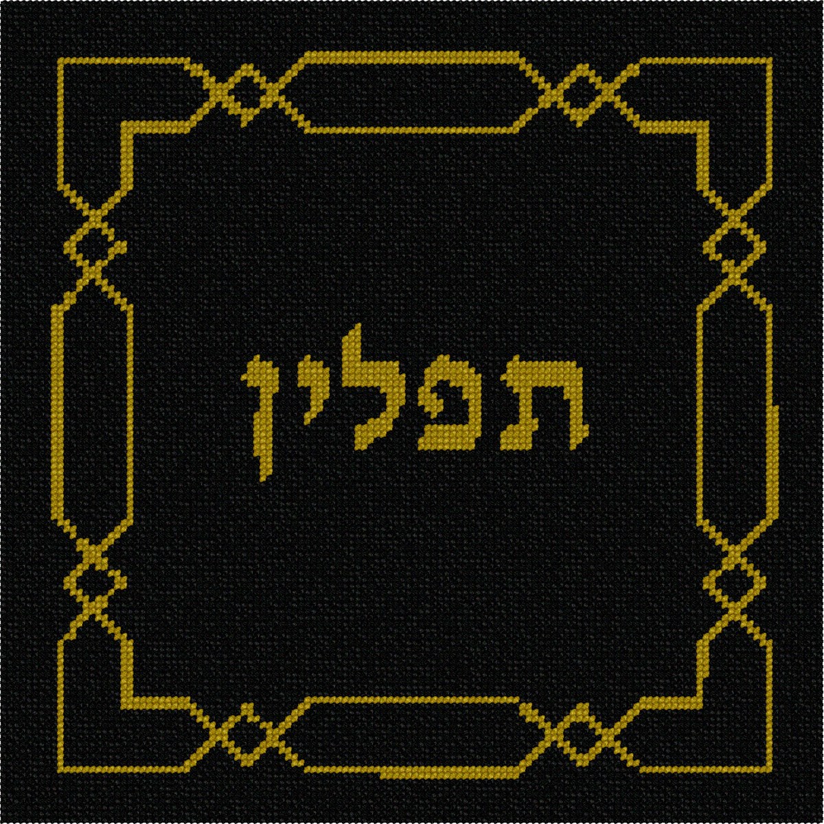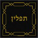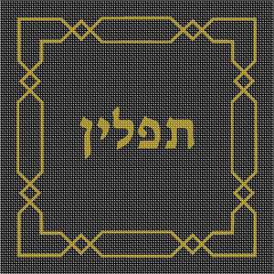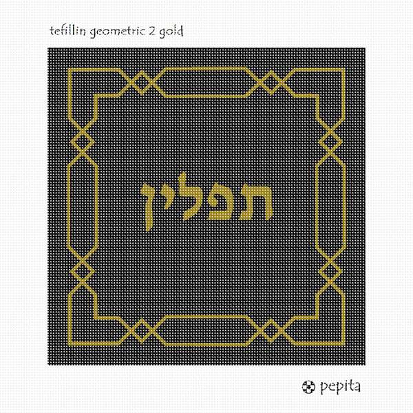 Tefillin bag design with gold etched geometric design. See matching tallit bag. Geometrics are very vogue in tallit and tefillin bags today. You stitch the front. After it is completely stitched, it is sent to a professional finisher who adds a lining, back, and matching zipper.