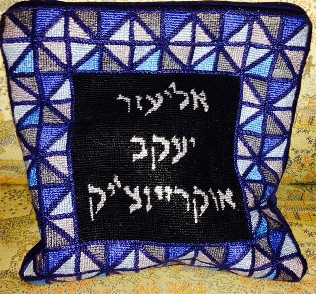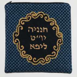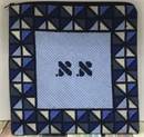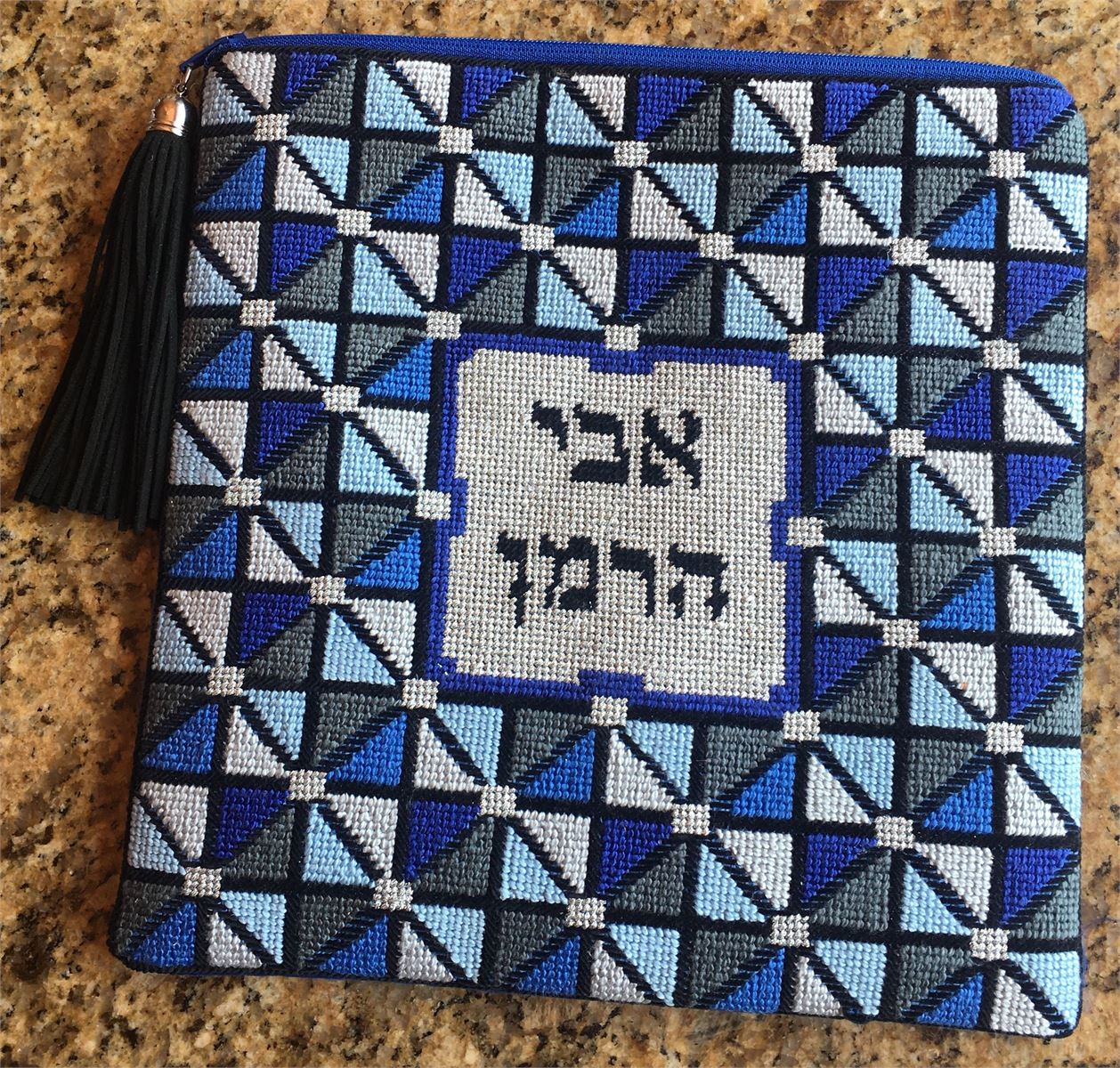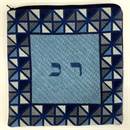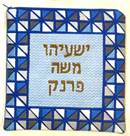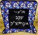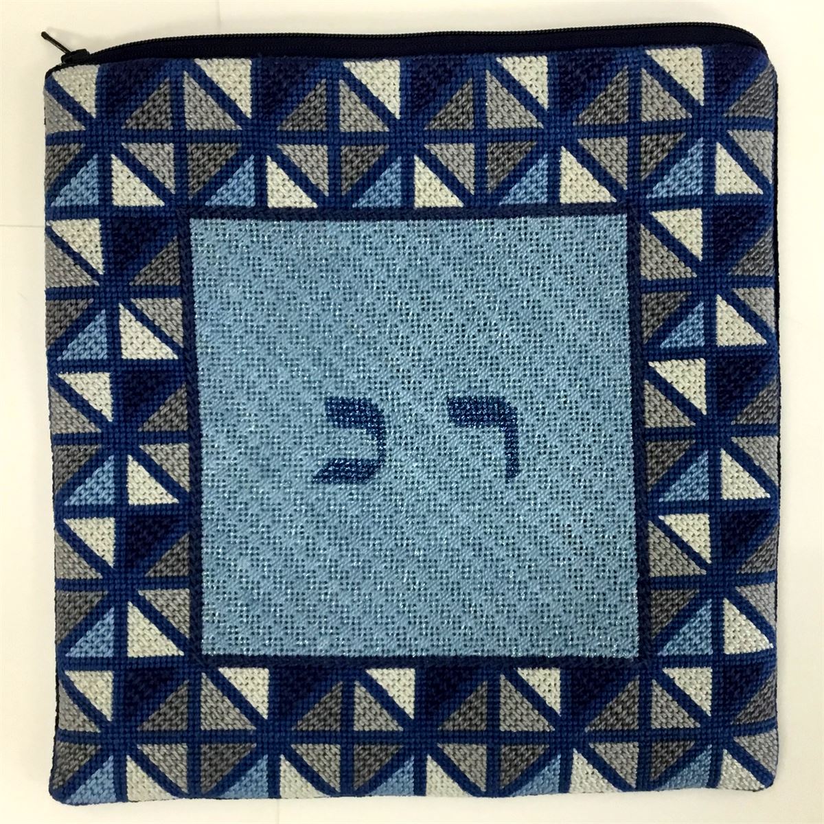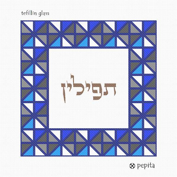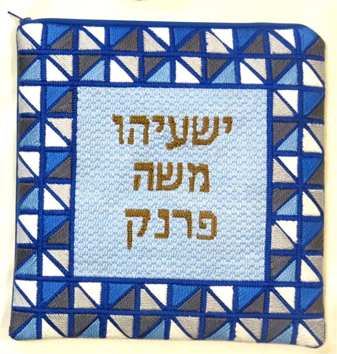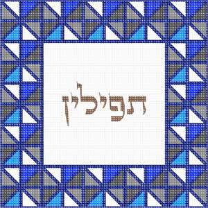 This unusual tefillin bag is designed as though it is framed by stained glass. Reflecting triangles in blue and gray.