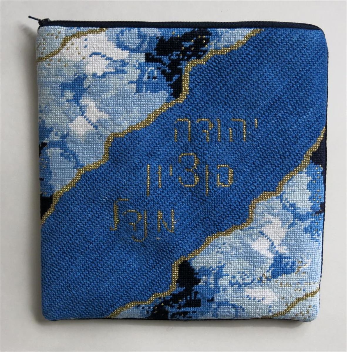 Gorgeous tefillin needlepoint with a modern marble design. Flecks of gold enhance the marbleized effect. After it is completely stitched, it is sent to a professional finisher who adds a lining and a back to turn it into a tefillin bag for a bar mitzvah to keep his treasured tefillin.