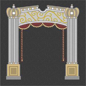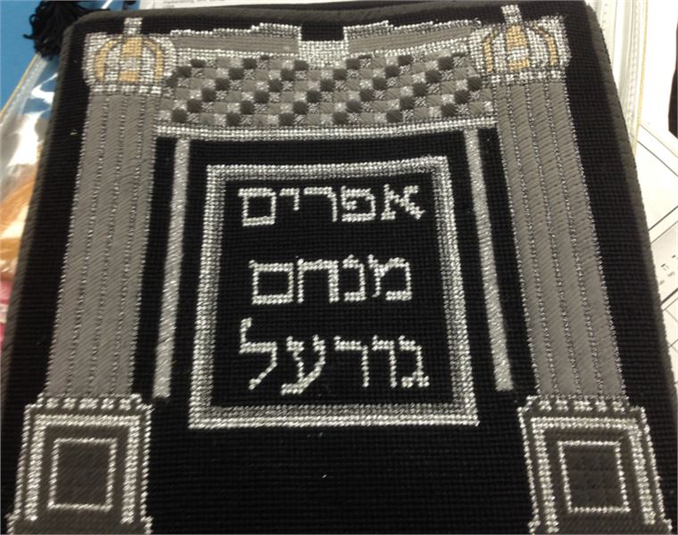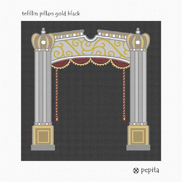 Tefillin bag with pillars, valence, crowns, rop, and tassels against black background. Pillars are quite popular on tefillin bag designs. You stitch the front. After it is completely stitched, it is sent to a professional finisher who adds a lining, back, and matching zipper.