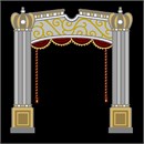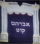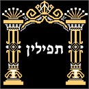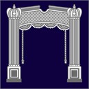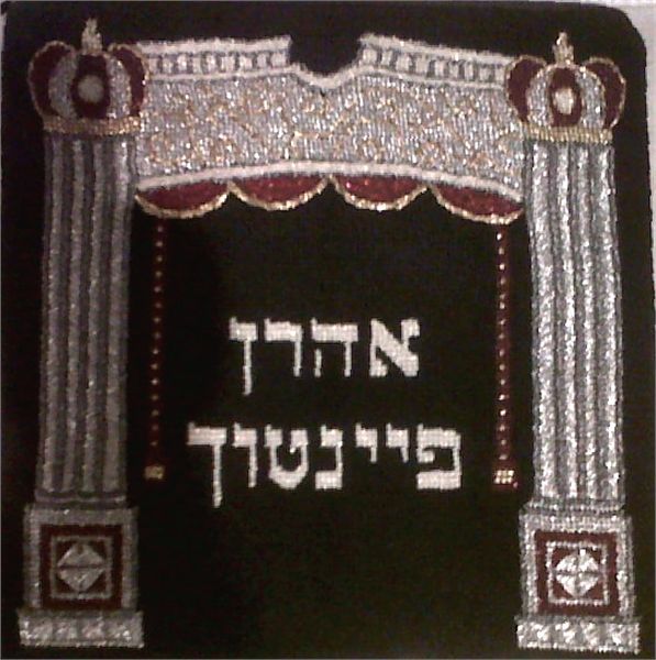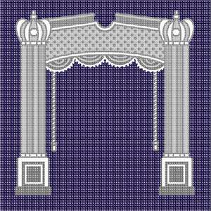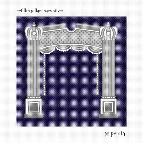 Tefillin bag with pillars, valence, crowns, rop, and tassels against black background. Pillars are quite popular on tefillin bag designs. You stitch the front. After it is completely stitched, it is sent to a professional finisher who adds a lining, back, and matching zipper.