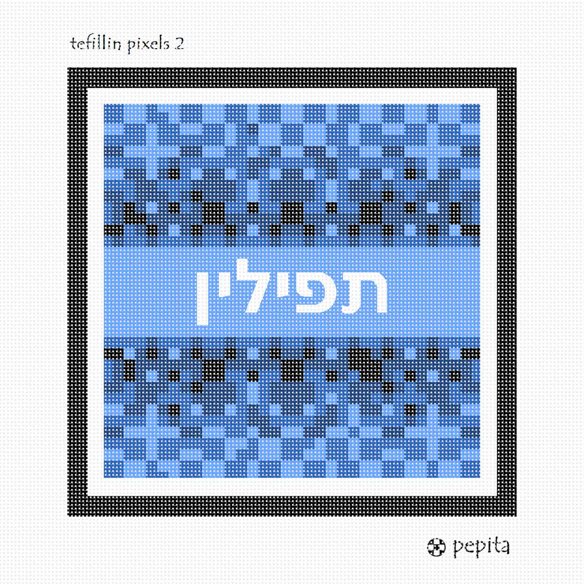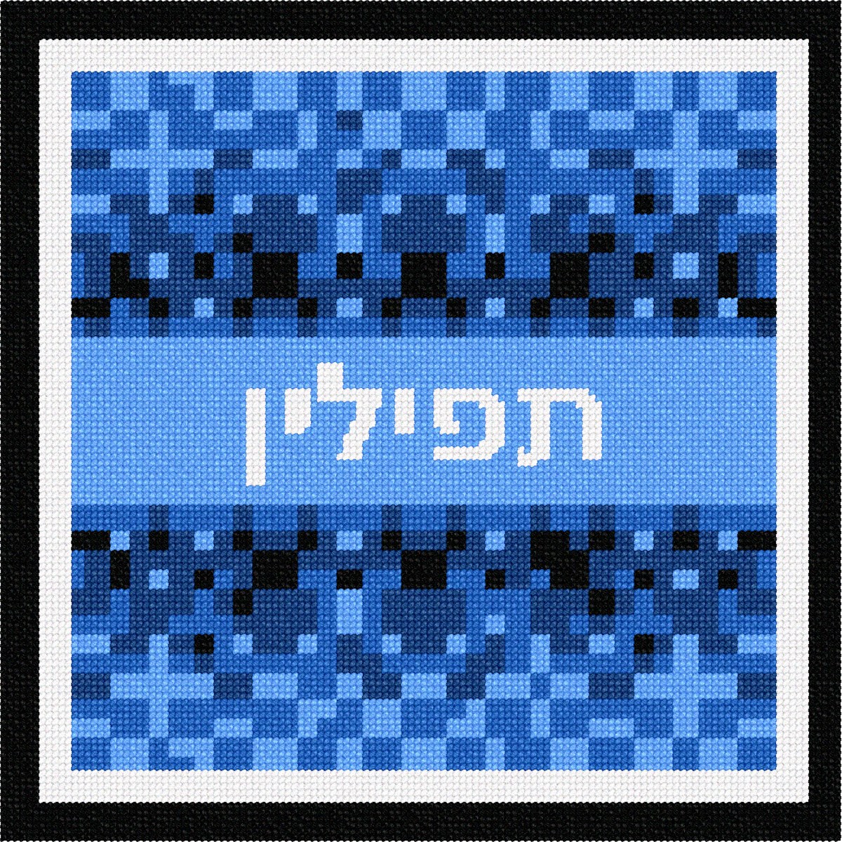 Pixels design on a geometric tefillin bag. You stitch the front. A professsional finisher turns it into a tefillin bag for a bar mitzvah boy.