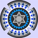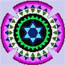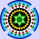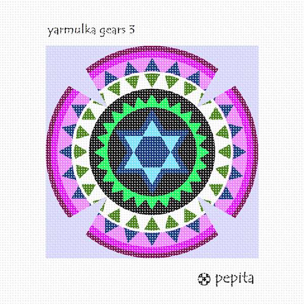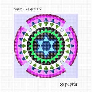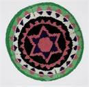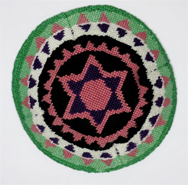 Kippah using a circular toothy pattern in vivid and contrasting colors. A kippah is a brimless cap, usually made of cloth, traditionally worn by Jewish males to fulfill the customary requirement that the head be covered. It is worn by men in Orthodox communities at all times.